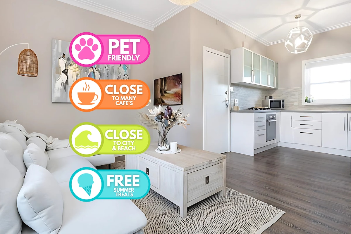 Escape the city! Only moments from the beach & lake, Ocean Breeze offers privacy & comfort. Enjoy a relaxing stay at our immaculate & modern apartment (attached to house but totally self-contained). Simply a couple of minutes walk to the beach, lake and eateries. Free WiFi, Netflix, Stan & A/C. Off-leash dog beaches are nearby, house-trained pets are welcome ( a one-off fee applies) but there is no fenced off-yard. The perfect getaway for couples or families/friends and fur-kids!