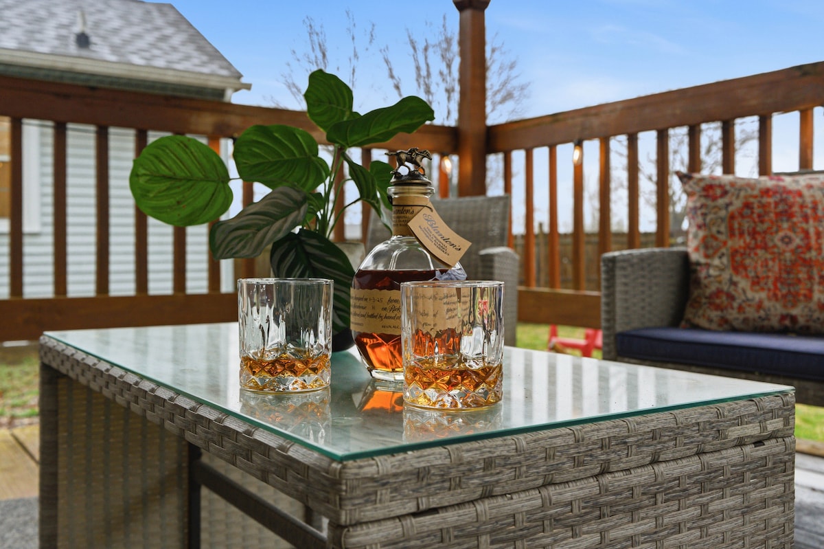 Retreat to your peaceful hangout after a day of exploring all that Bardstown and KY have to offer! Relax by the fireplace and stream a movie on the 75" TV, cook a full meal in the well-stocked kitchen, create a unique cocktail with all the tools you could wish for, breathe fresh air on the screened-in porch that borders greenspace, challenge friends to poker in the game room, grill dinner on our charcoal grill, or roast hot dogs and s'mores on the firepit area. This must be the place.