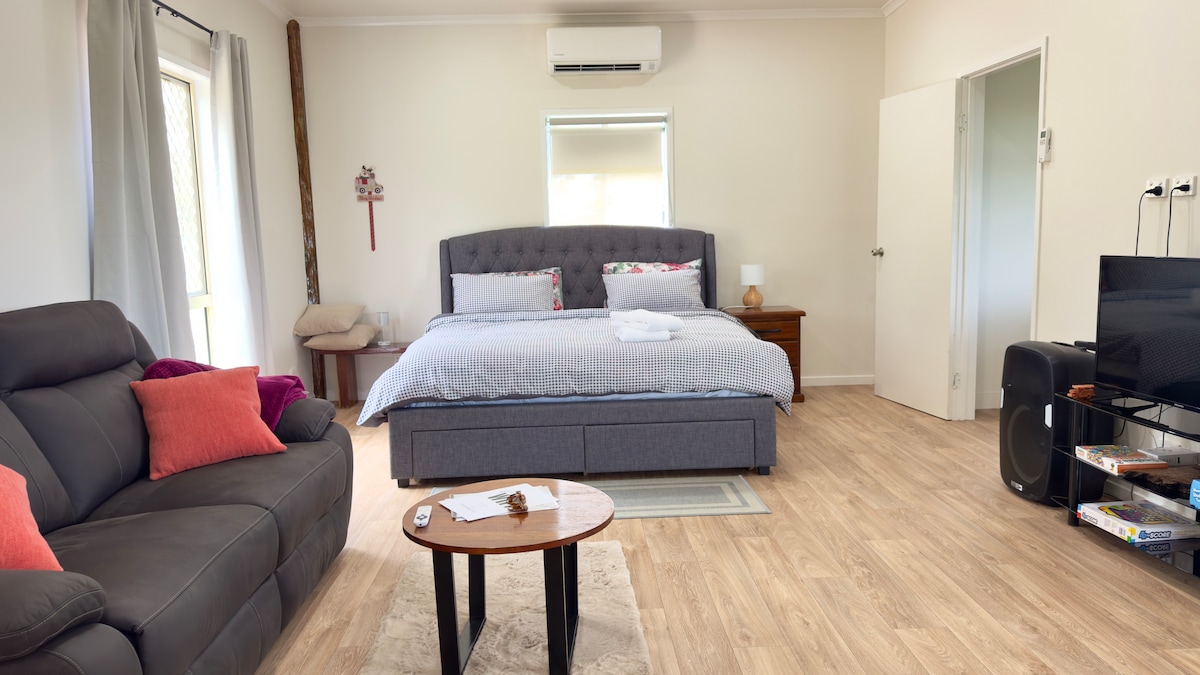 Private and spacious room offers a queen bed, kitchenette and sofa with an accessible bathroom. Outside the patio overlooks bush land and Burnett River with seating and bbq. 10 minutes to shopping centre and restaurants, 15 minutes to Bundaberg CBD. Please note there is NO Wi-Fi, but we have Telstra and Optus reception and you can hotspot to the TV for streaming services. We do not allow dogs onsite, this is for their own safety as our property is not fully fenced.