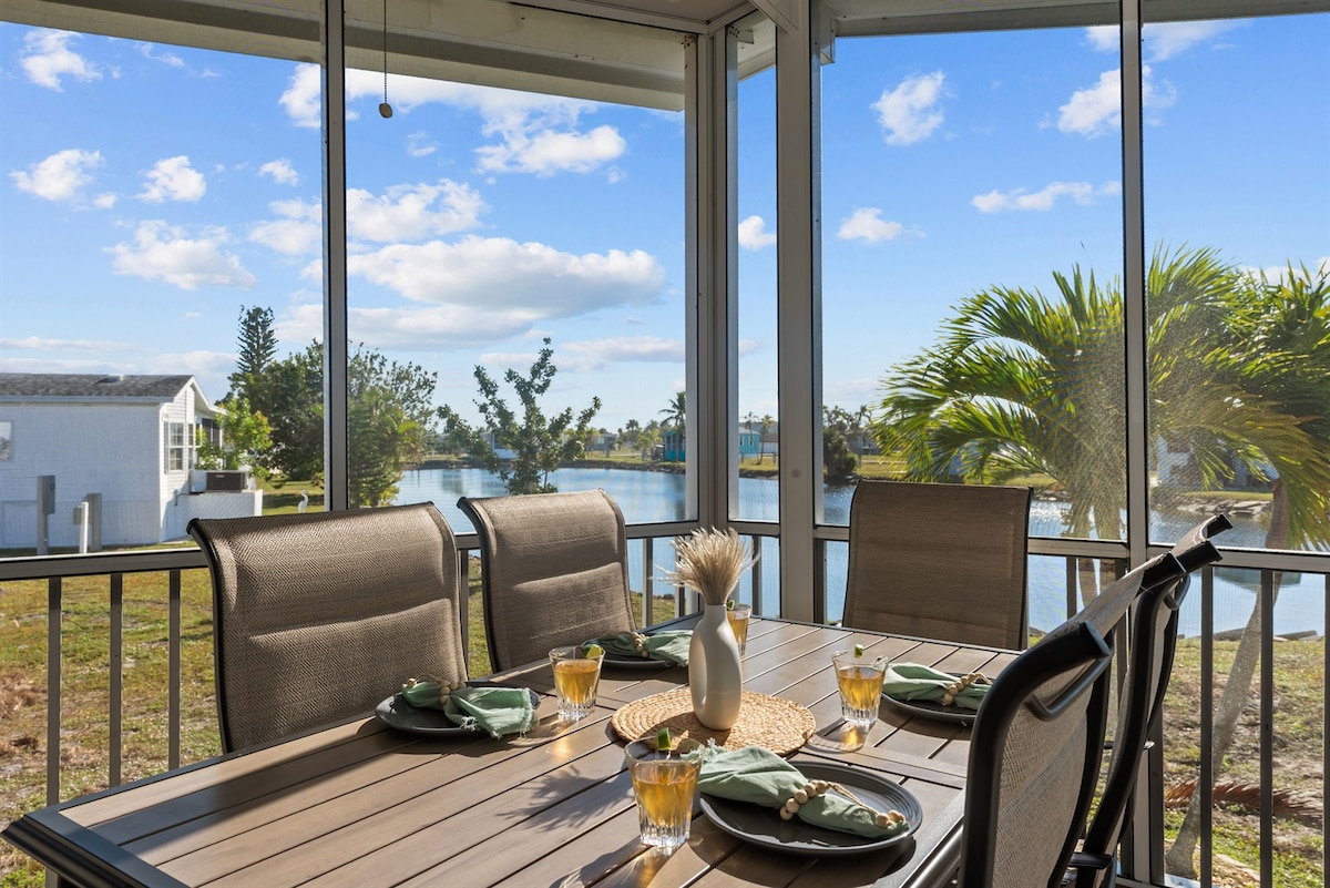 Beautiful 3 Bedroom, 3 bath home on a canal with a dock! Bring your boat or jet skis! Enjoy a relaxing stay watching the dolphins and manatee right off the dock. This exquisitely updated home has everything you need for a fantastic vacation. Especially location! 5 minutes to Ft Meyers Beach. Enjoy the resort right in your own backyard. New pool with hot tub and sun shelf. Enjoy beautiful sunsets off the huge patio. Trolly to beach at neighborhood entrance or walk to in minutes.
