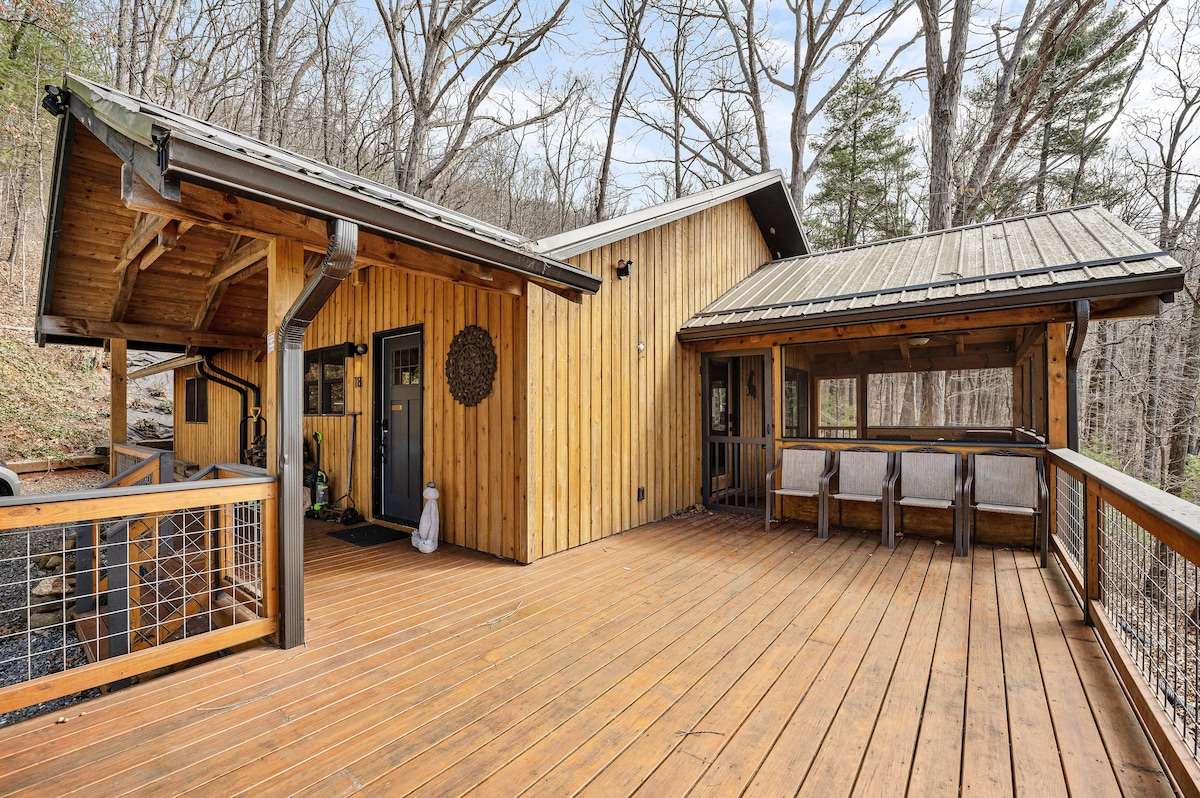 Relax at our modern, rustic chic, cedar cabin just 2 miles from downtown Asheville. Floor-to-ceiling windows bring the forest indoors while vaulted wood ceilings, rustic charm, and thoughtful design create a warm, open feel. Relax by the fireplace, on the screened porch, or dine outside under the trees. Quiet, private, and well-stocked for a restorative stay.