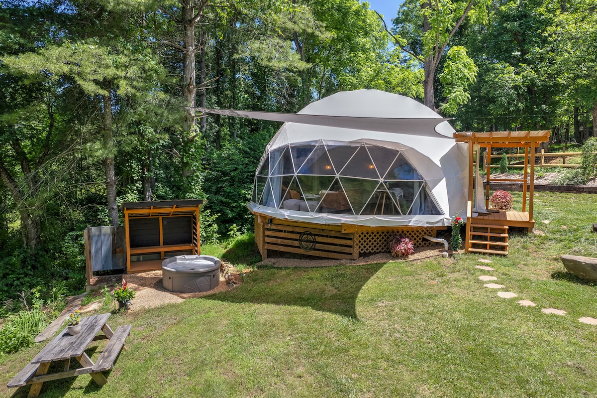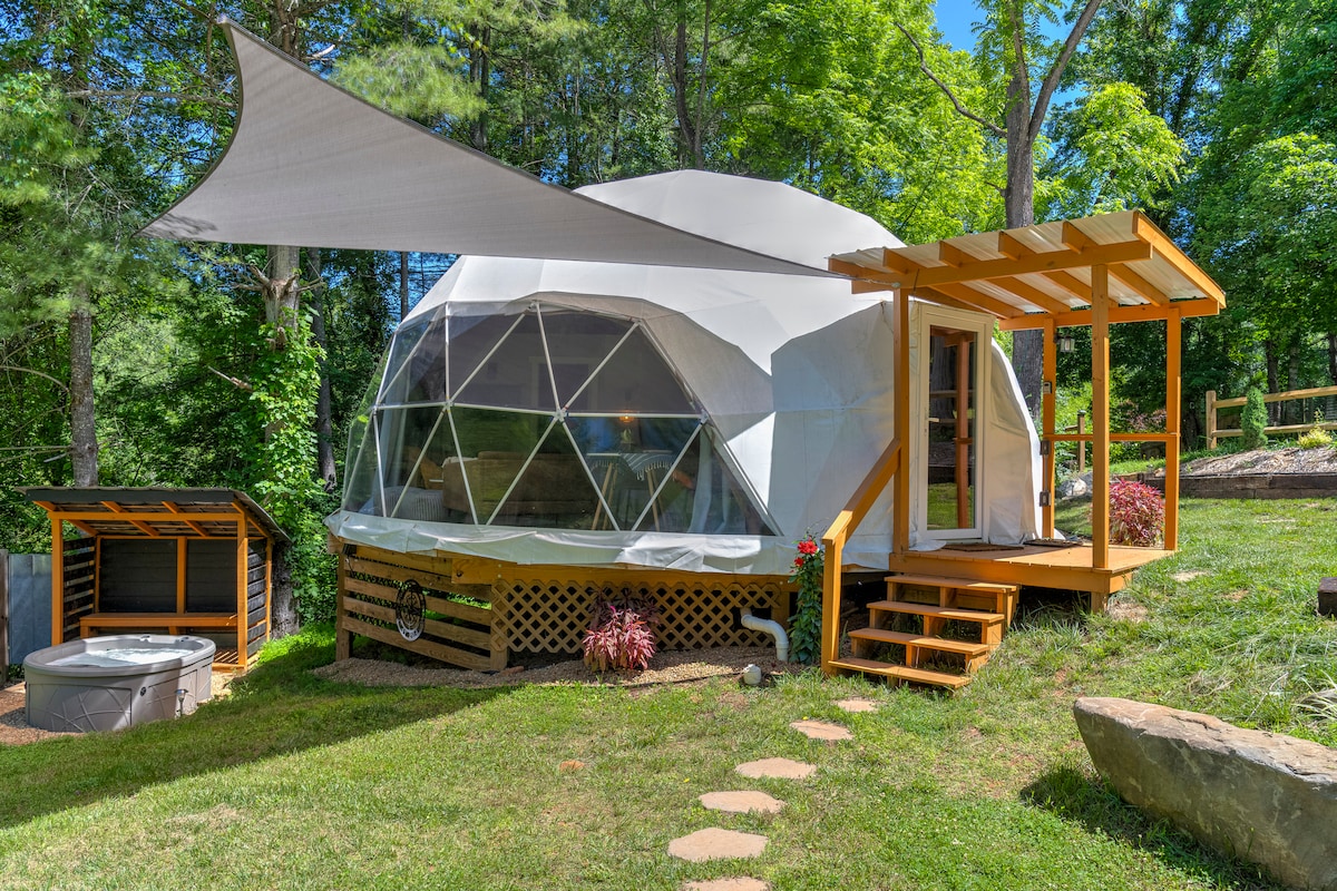 Escape to this unique and luxurious glamping dome with stunning mountain views. Enjoy the huge bay window perfect for watching sunrises and sunsets from the cozy couch. Relax outdoors in the hot tub, firepit, or ENO hammock, all while surrounded by nature’s beauty. Just 20 minutes from downtown Asheville, it’s your private mountain oasis. Follow us on Insta! @glamp_avl ◆ Heat and AC ◆ Cozy wood burning stove ◆ Outdoor hot tub ◆ Firepit for evenings ◆ Comfortable King bed