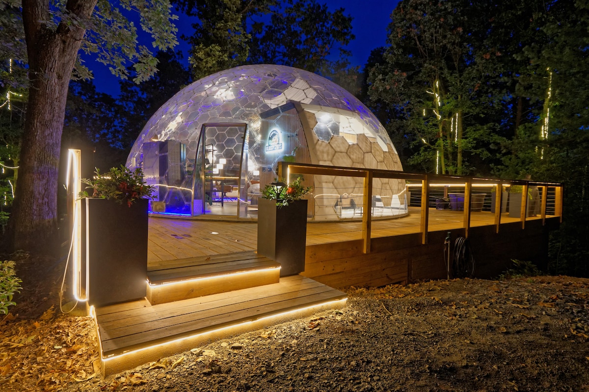 Sleep Beneath the Stars in America’s Largest Transparent Dome – 20 Minutes north of Asheville! This one-of-a-kind stay invites you to reconnect—with your partner, your family, or the beauty of nature. Relax in luxury under the stars. Soak in the private hot tub within the trees. Cook a meal in your fully stocked kitchen and gather around the fire pit under the open sky. Every detail is designed for magic, comfort, and connection. Experience the wild—wrapped in luxury.