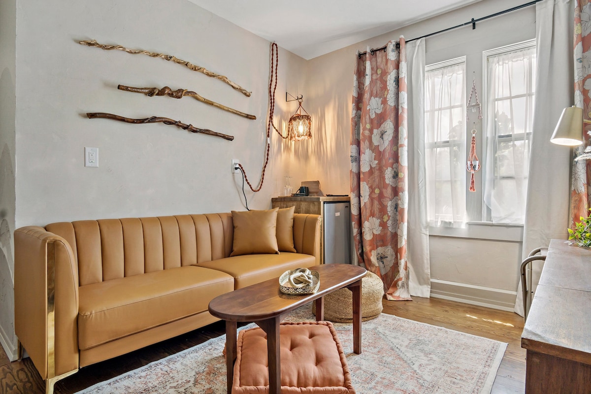 1936 Georgian-Revival, turned Coffee + Cocktail Bar, Housing NC's Smallest Boutique Hotel. This moody, color-drenched studio offers a private balcony with mountain views. Please note: the coffee/bar is open to the public and there is potential for noise. The bar closes at 9pm on weekdays and 10pm on Fri/Sat. Hotel is suggested adults only (21+)