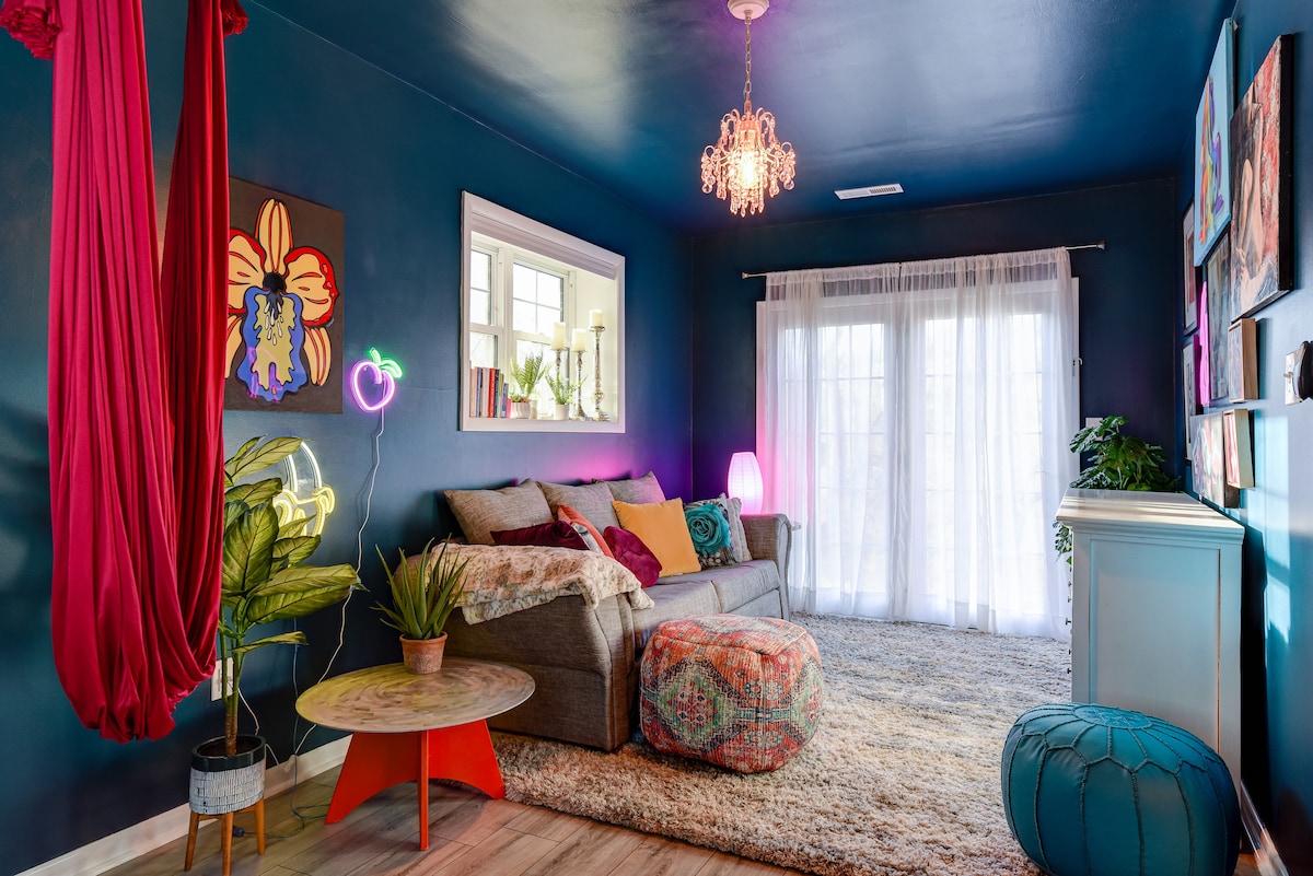 This bohemian haven offers vintage pieces, handmade and artful decor, and a sweet look at local life. ✔ Prime Location: Only 1 mile from downtown’s best attractions. ✔ Comfortable Living: Fully equipped kitchen, cozy seating, and hotel-quality bedding. ✔ Outdoor Bliss: Firepit, patio and mountain views. ✔ Bright and Minimalist: Stylish interiors with warm, inviting touches. ✔ Perfect for romantic getaways, work trips, or a peaceful retreat in any season.