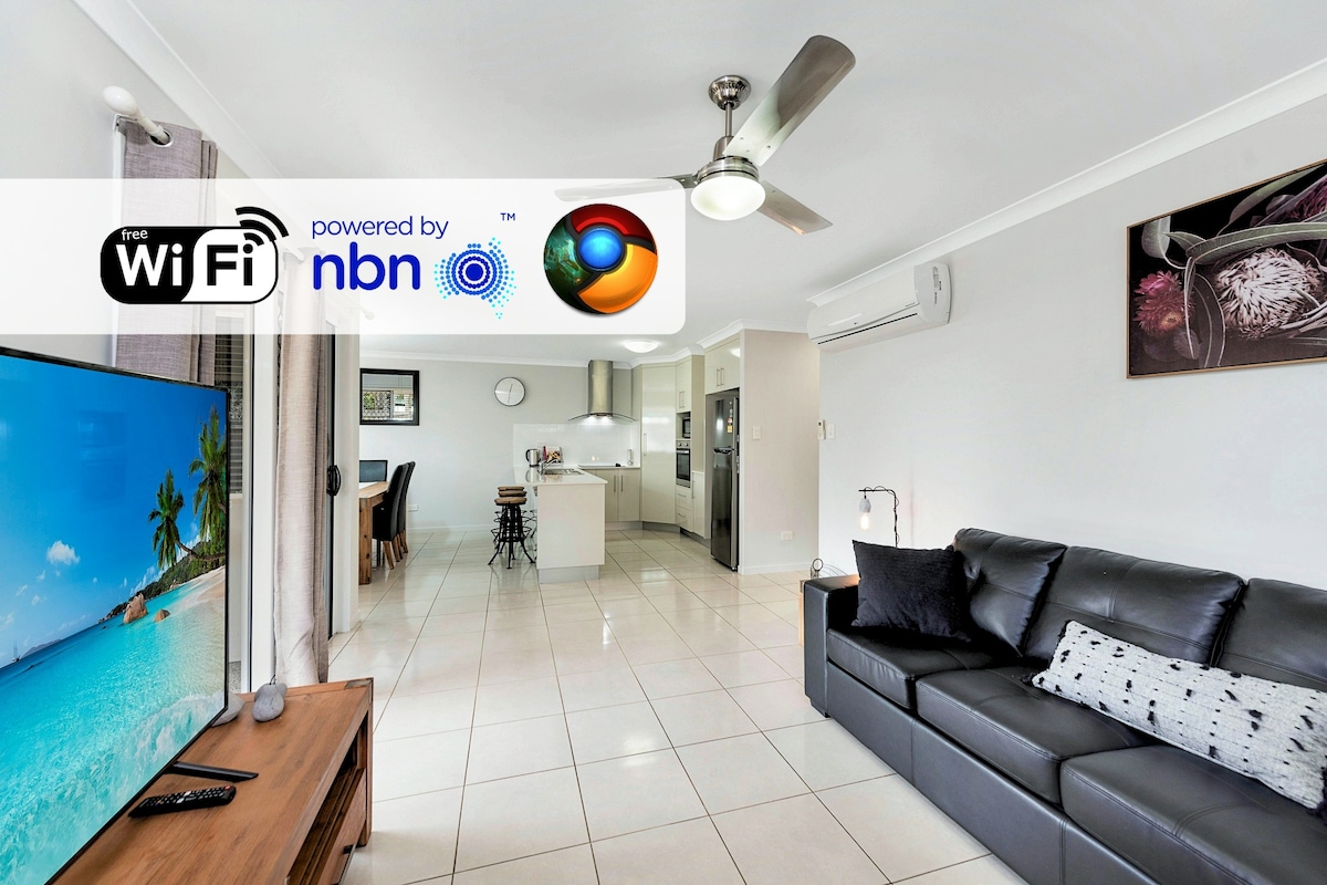 This beautifully presented modern villa is sure to impress. It's a lowset, air conditioned, open plan space with 3 bedrooms , 2 bathrooms, a fully appointed kitchen, laundry and charming outdoor area. The perfect space to relax and enjoy a home away from home in the cool air conditioned rooms using the Unlimited WIFI. Relax in a full sized bath or enjoy the incredible rainfall showers. There is secure parking for 2 cars. You can even order a gourmet or pampering hamper for your arrival!