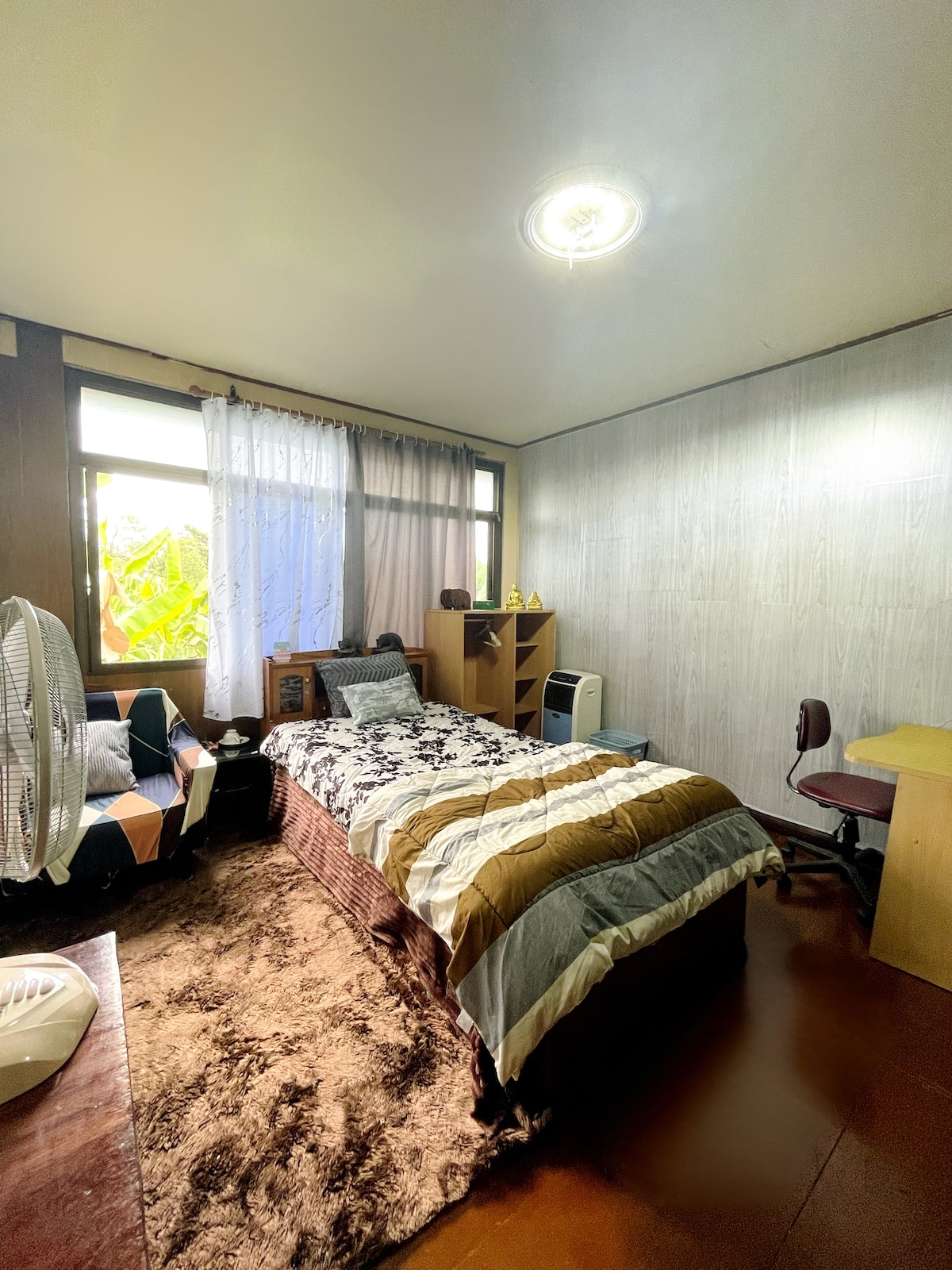 Relax with the whole family at this peaceful place to stay. Single couple family and or pet allowed to have rest and execerise in the widing gargen and ponds with beautiful trees and flowers Good for staying cool and clam cooking and joging or riding mortercle around the area can do well.