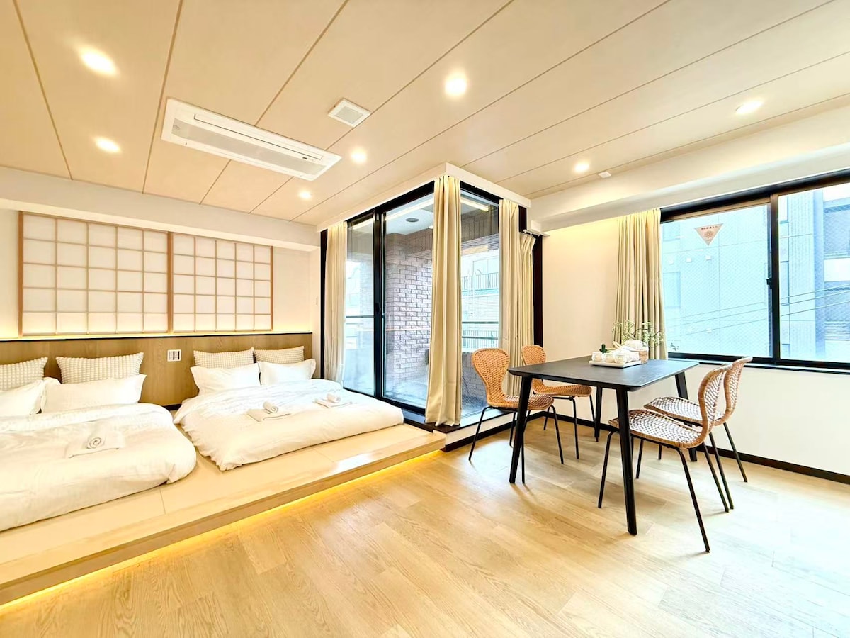 🏡 谷根千の魅力溢れるアパート|家族・グループに最適 当宿は、東京の人気観光エリア「谷根千(谷中・根津・千駄木)」に位置するアパートの2階部分をまるごと貸切でご利用いただけます。 昭和レトロな街並みが残る下町風情とアクセス抜群の立地が魅力。西日暮里駅や東京駅にも好アクセスで、新幹線・空港利用にも便利です。 最大6名まで宿泊可能!グループ・家族旅行に最適 寝具:敷き布団×2、クイーンベッド×1、ソファベッド×1 モダンな空間:黒と白を基調とした洗練モノトーンインテリア エンタメ設備:任天堂スイッチ、プロジェクターで映画&ゲームを満喫 長期滞在対応:フルキッチン&洗濯機完備&徒歩3分にコインランドリーあり 🚉 主要エリアへのアクセス抜群 東京:17分(千代田線) 池袋:15分(JR西日暮里駅経由) 浅草:23分(千代田線+銀座線) 銀座:15分(千代田線+日比谷線) 渋谷:30分(千代田線+副都心線) 🎌 周辺観光&便利な立地 谷中銀座商店街で食べ歩き&昭和レトロ体験 徒歩圏にコンビニ・スーパーあり、滞在中も快適