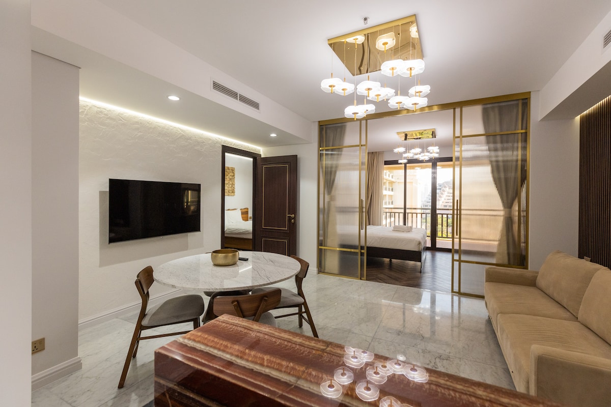 Seven Palm Residence offers unparalleled luxury in the heart of Palm Jumeirah, ideally located on the iconic Palm West Beach, featuring a private beach exclusively for residents. Just a 5-minute walk to Nakheel Mall. Seven Palm is split into two sections: a 5-star hotel and an exclusive residential area. You’ll have free access to all the five-star facilities, like a rooftop pool with amazing views, a kids' area, a fully equipped gym, and a private beach.