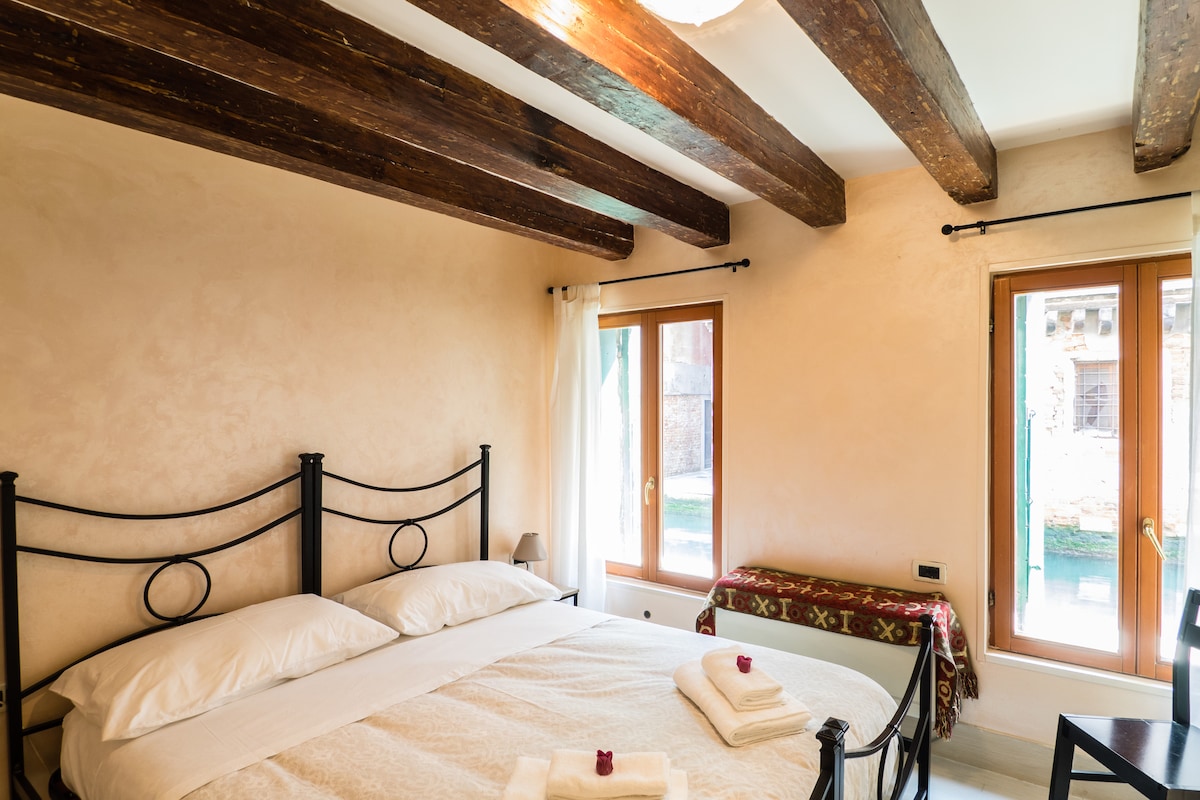 Admire the beauty of Venice from the arched windows of this welcoming and spacious apartment which combines historical elements, such as wooden beams, and contemporary furnishings. From the large windows you can enjoy a beautiful view of the canal, crossed by gondolas, and of the typical Gothic buildings of Dorsoduro, the most authentic district of Venice, appreciated by artists and intellectuals of all ages; equipped with two bathrooms and every comfort, you will find books and art objects.