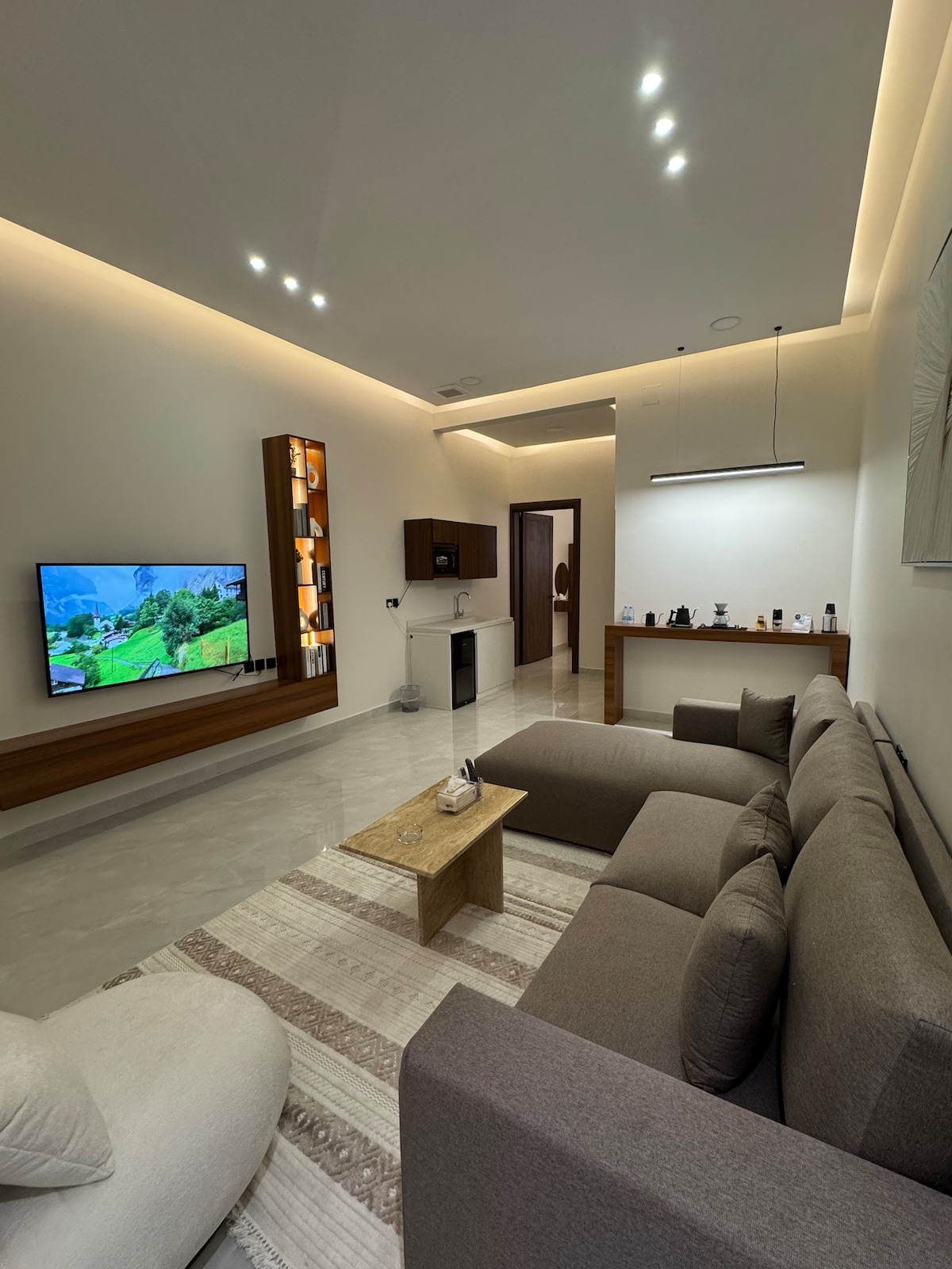 شقة بتصميم عصري مريح بدخول ذاتي تتكون من غرفة نوم وركن تحضيري ومنطقة مخصصة للقهوة وصالة ودورة مياه بيئة منزلية دافئة، توفر لك الراحة والخصوصية والعديد من المميزات التي تلبي جميع احتياجاتك