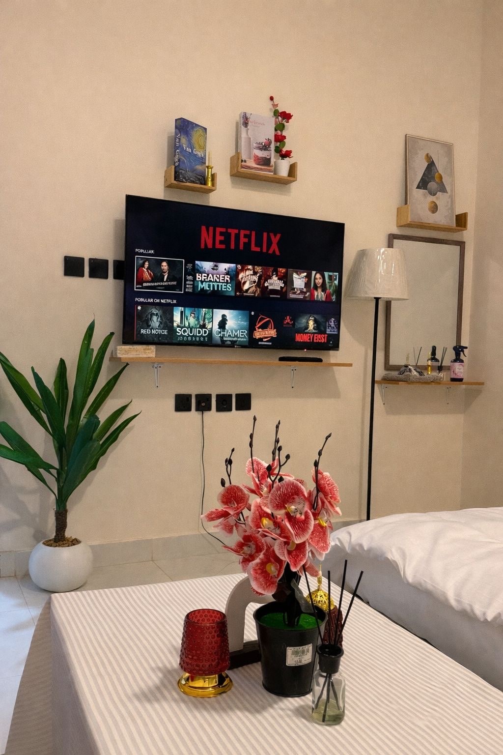 شقة فخمة وأنيقة تجمع بين الهدوء والعصرية، مجهزة بكل التفاصيل الجميلة لقضاء أجمل أوقاتك. تحتوي الشقة على دخول ذاتي وسرير ماستر مع مرتبة مريحة، بالإضافة إلى تلفزيون ذكي 75 بوصة بدقة 4K لمتابعة نتفلكس، يوتيوب، شاهد والمزيد. تحتوي أيضًا على كنبة جلوس مريحة جدًا وإضاءات متنوعة تتناسب مع أجوائك من الهادئ إلى العالي، إلى جانب ثلاجة وأكواب بطرازات مختلفة. كل شيء قريب وتتوافر جميع الخدمات، حياك الله في مكانك!