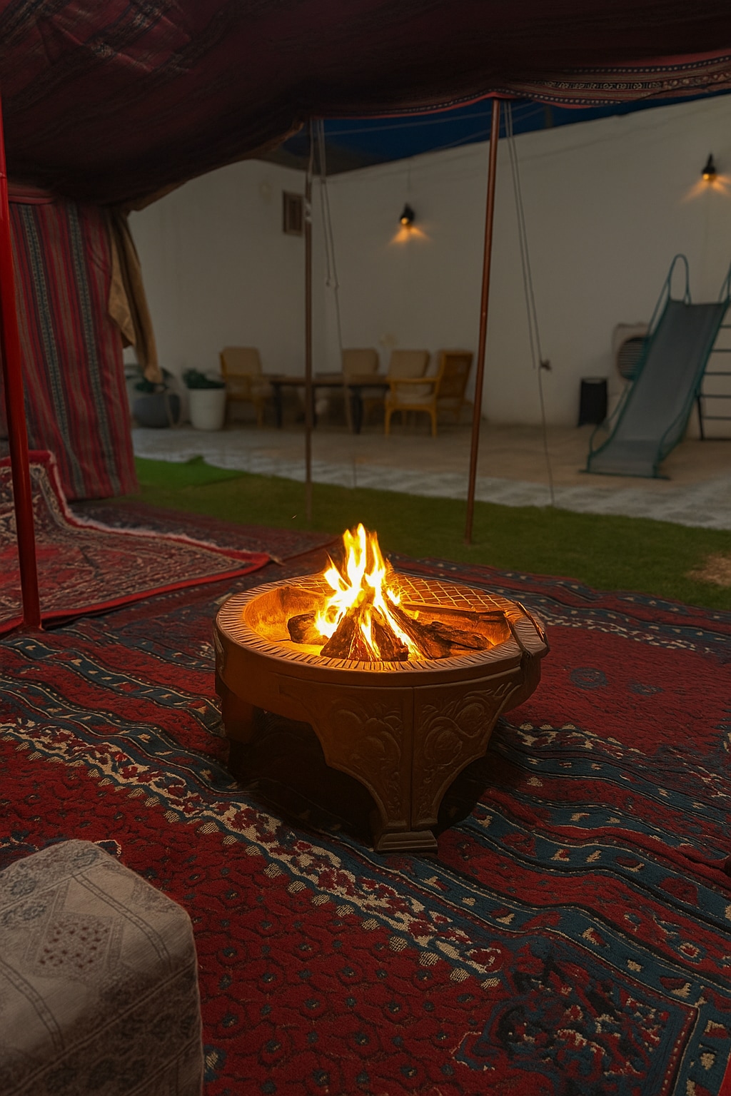 Make some memories in this special and family place ✨ A luxurious chalet featuring: An elegant living room with a TV and exceptional decor 😍 1 master bedroom 1 bedroom with two single beds A fully equipped kitchen A dining table with four chairs + bathrooms (traditional Arabic toilet Western-style toilet) Outdoor area: A ground seating area with a fireplace A complimentary bundle of firewood for each guest 🤩🪵🔥 A green lawn 🌿 A deep swimming pool with a children's pool A car entrance 🚘
