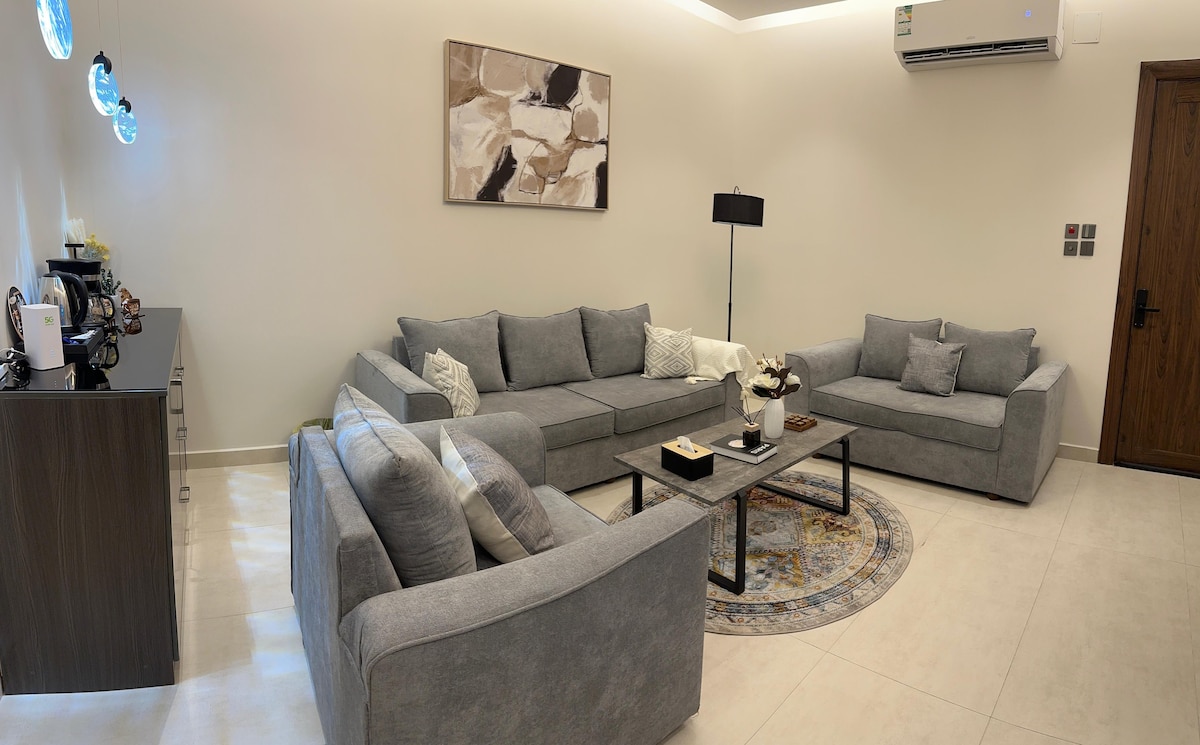 شقة فاخرة تتميز بالخصوصيه والأمان بدخول ذكي وتحتوي على غرفة نوم بسرير ماستر واحتياجات غرفة النوم لليلة هانئة وصالة منفصلة تتسع لخمس ضيوف مع شاشة ذكية لسهرة ممتعة وشبكة إنترنت مجانية بالإضافة إلى ضيافة ماء وشاي ومكينة إعداد القهوة وغلاية ومطبخ يحتوي على ثلاجة ودورت مياه تحتوي على أدوات الاستحمام الخاصة بك يومك سعيد..