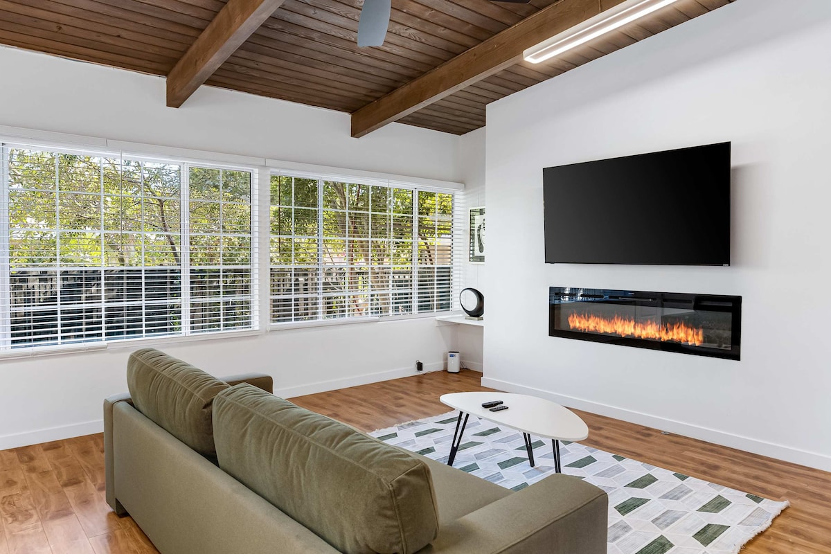 Midcentury modern 2bed/2bath stilt home with spectacular views above Sunset Strip (2 blocks up from Hollywood + Fairfax). Only blocks from the action, but very private and quiet. Recent renovations from roof to foundation, heat/AC system, 1 Giga/sec wifi, wired in + out with 11 speakers, movie projector + two 4k TVs (free Netflix, HBOMax and AppleTV+), 2-car parking with level 2 electric charger. Please note: No social gatherings or late, loud nights. Interior = 1015 sq ft. Deck = 300 sq ft.