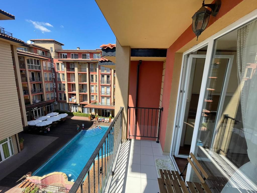 "Barcelo Royal Beach" belongs to the Spanish brand of hotels. It is located in the center of Sunny Beach on the main promenade. There is free WIFI in the facility. The hotel has 3 outdoor pools and 1 indoor pool. Next to it there is a saunarium with a gym and a SPA center. The apartment offers a pools view, a spacious living room area with kitchenette, private bedroom with king size bed, big balcony and bathroom with bath. It is possible to buy meals and parking at the hotel reception.