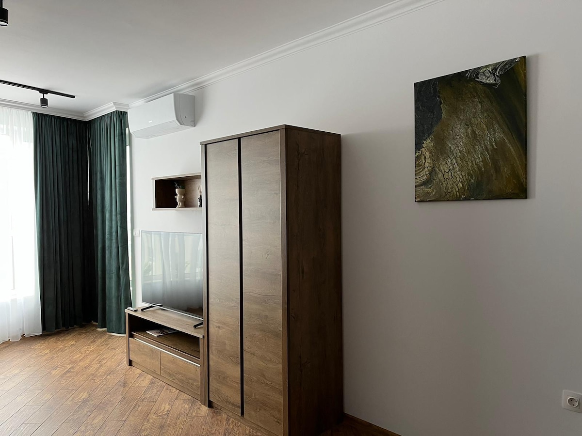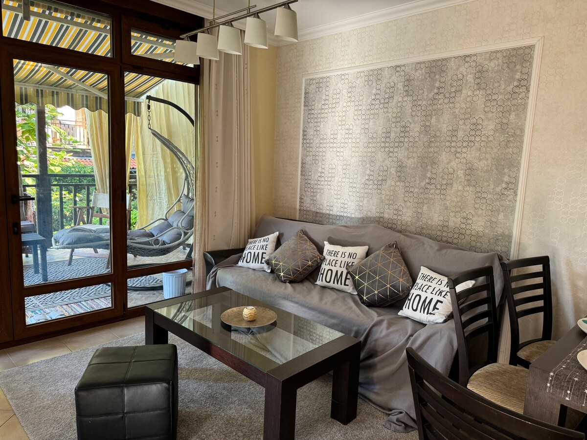 Welcome to our Sunny Haven in Burgas! This cozy, brand-new apartment features 1 bedroom, a common room combining a kitchen and living area, and a modern bathroom, it’s perfect for a comfortable stay. For your convenience, secure parking is included. Enjoy a peaceful retreat in a nice neighborhood, just a short distance from the city's attractions.