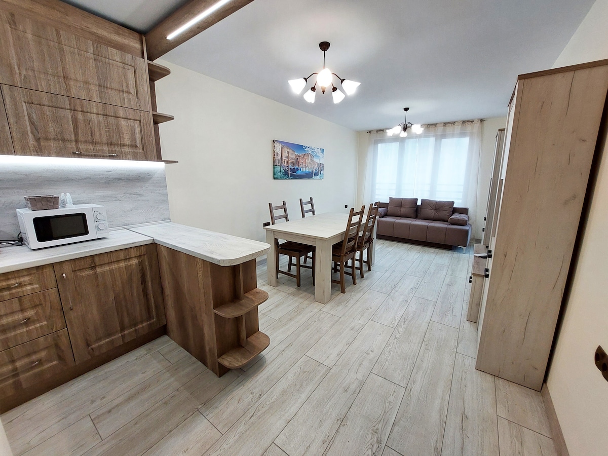Modern and cozy apartment in the center of Burgas, just 5 minutes (350 m) from the beach. Features a stylish bedroom with soft lighting, a comfy sofa, smart TV, air conditioning, and fast Wi-Fi. The kitchen is fully equipped with a stove, microwave, fridge, and dining area. The bathroom is fresh and functional. Apartment located near restaurants, shops, and transport — perfect for a beach getaway, romantic stay, or working remotely.