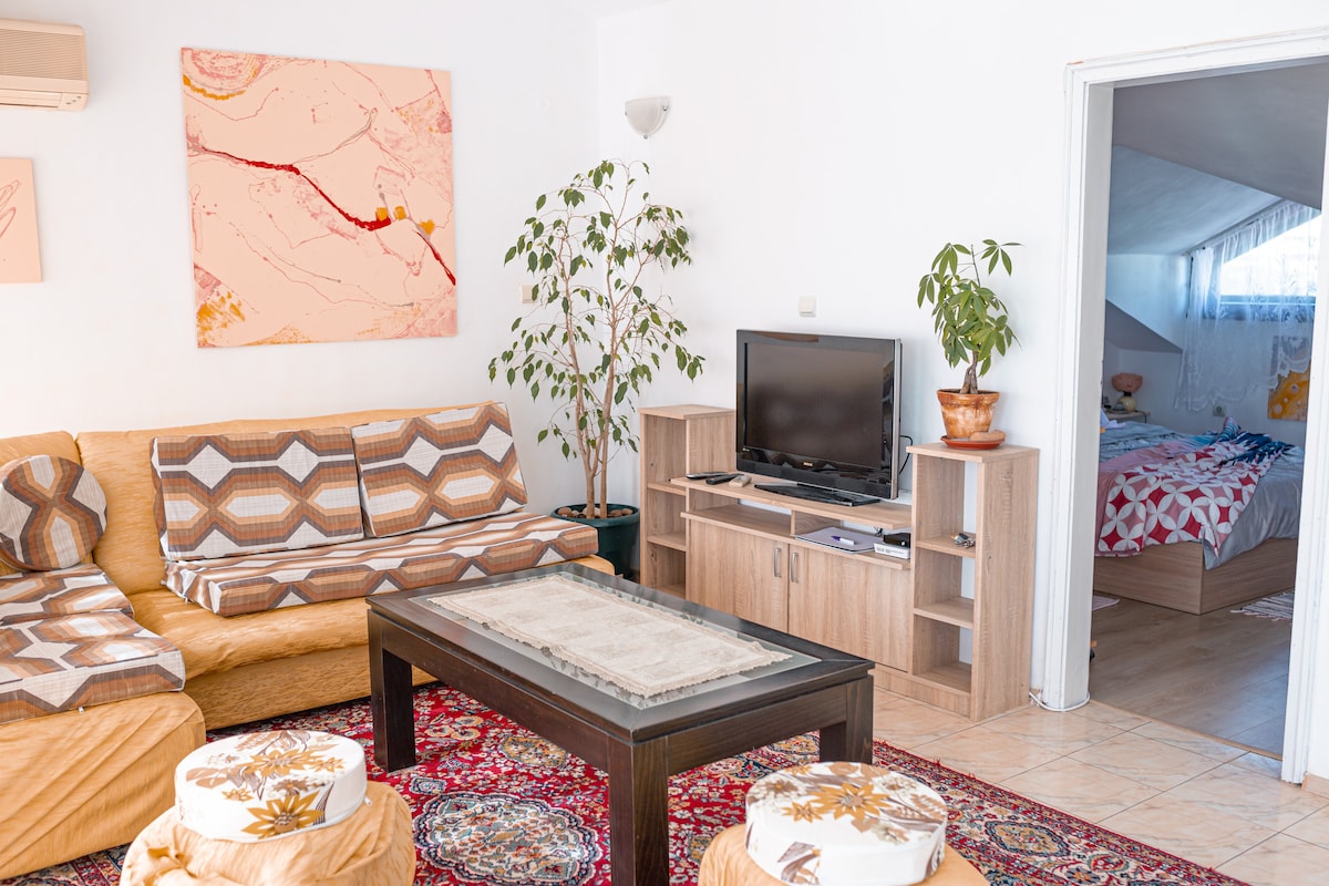 Cozy, family-oriented place, mainly used from my friends. Whenever it's available, I let this, very personal, project to my future friends. I have made this place for my comfort. It's all natural, with environmentally-friendly materials and a 'safe guard' electricity auto protection. It is the only apartment on the 4th floor, no elevator! In winter you can seen Black Sea through the Sea Garden from the window. 5 min walk to the beach and so to the main street.