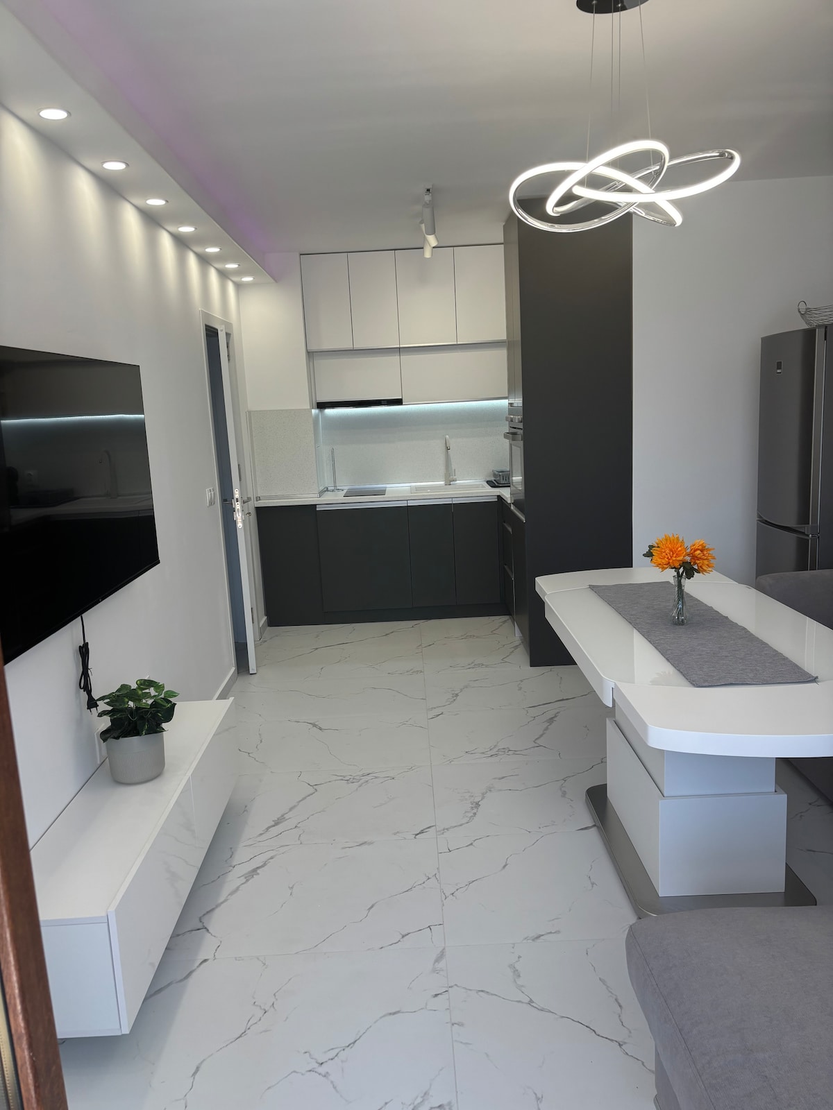 Modern and cozy apartment in the center of Burgas, just 5 minutes (350 m) from the beach. Features a stylish bedroom with soft lighting, a comfy sofa, smart TV, air conditioning, and fast Wi-Fi. The kitchen is fully equipped with a stove, microwave, fridge, and dining area. The bathroom is fresh and functional. Apartment located near restaurants, shops, and transport — perfect for a beach getaway, romantic stay, or working remotely.