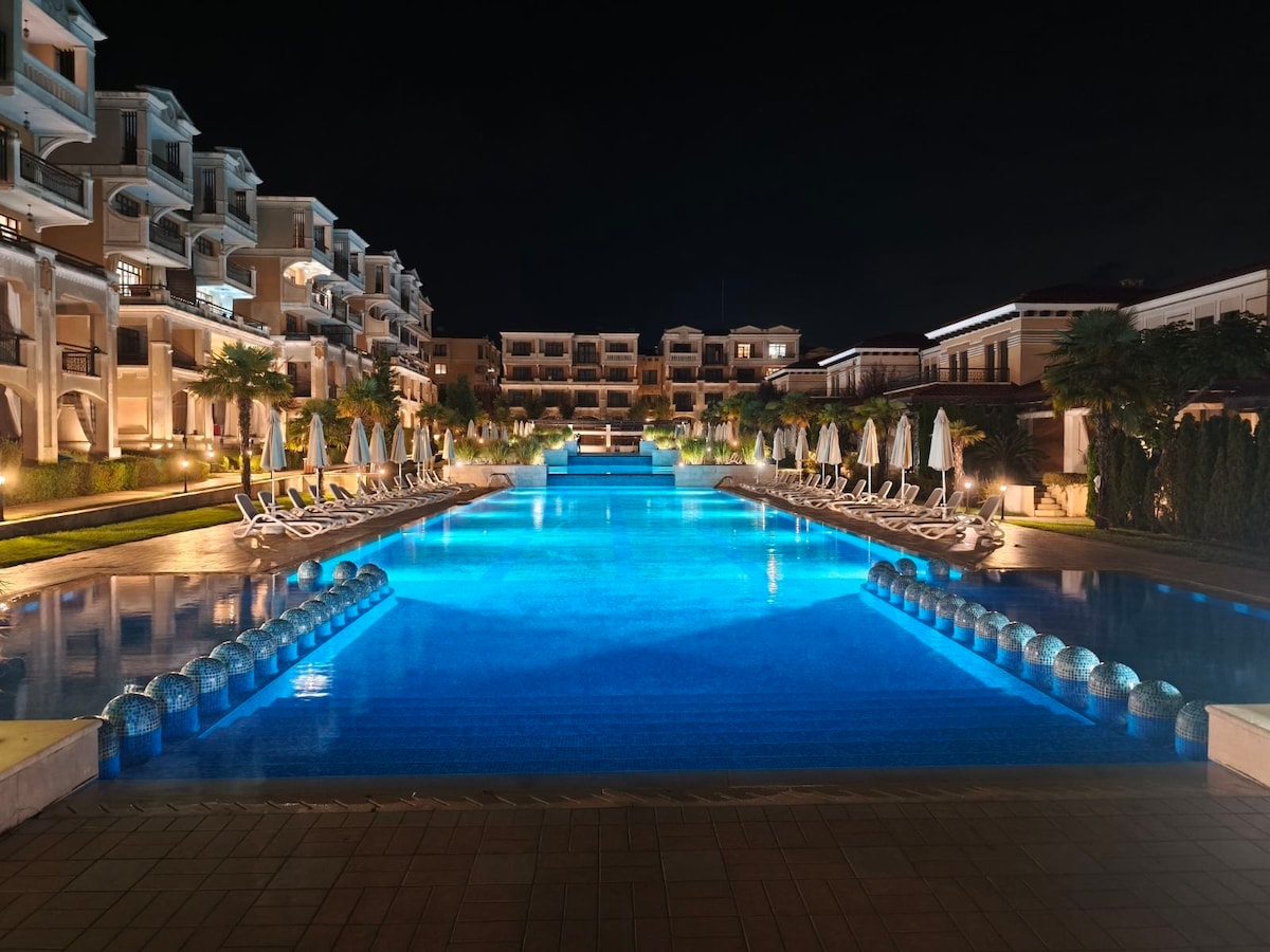 "Barcelo Royal Beach" belongs to the Spanish brand of hotels. It is located in the center of Sunny Beach on the main promenade. There is free WIFI in the facility. The hotel has 3 outdoor pools and 1 indoor pool. Next to it there is a saunarium with a gym and a SPA center. The apartment offers a pools view, a spacious living room area with kitchenette, private bedroom with king size bed, big balcony and bathroom with bath. It is possible to buy meals and parking at the hotel reception.