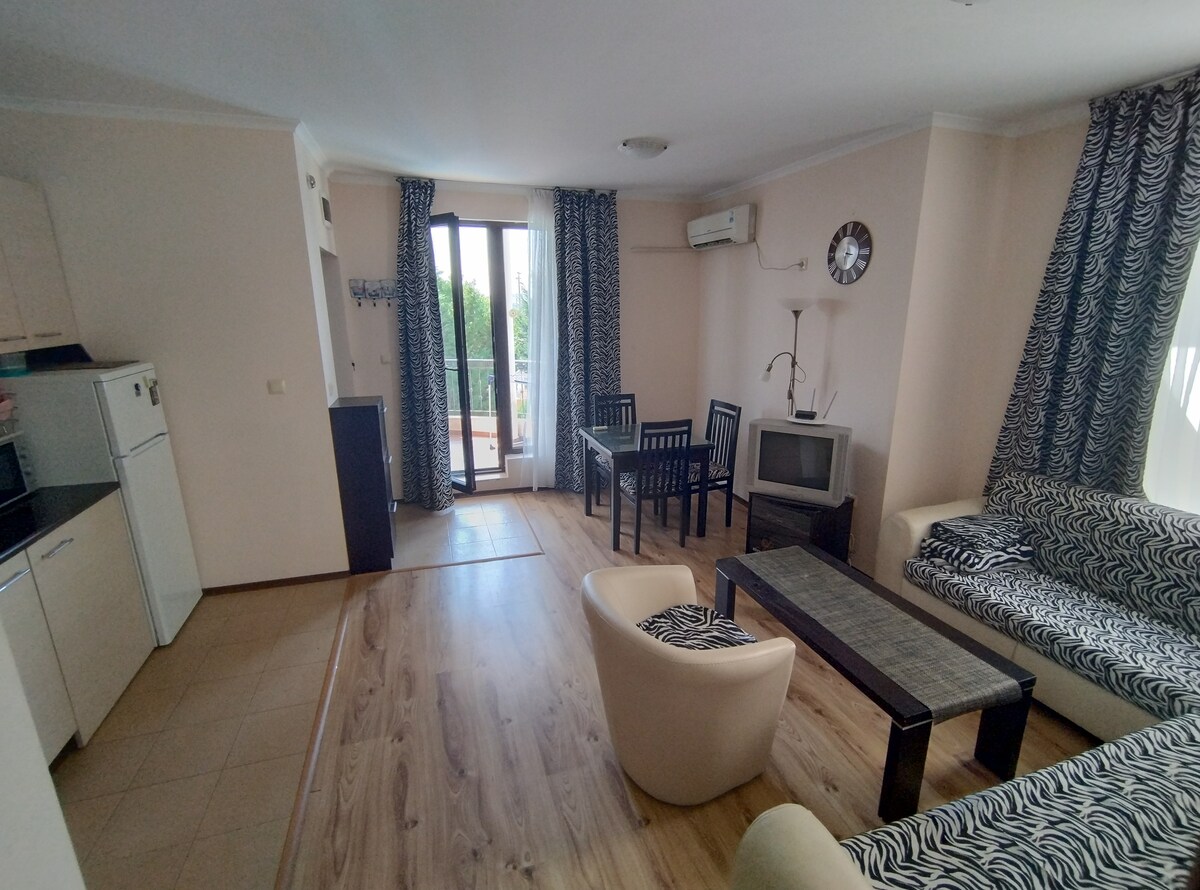 The apartment is situated in the Sunny Beach resort. The beach is only 450m away. Busy district, easy access to main street and the centre with all the communications and places. The popular aquapark is not far. The apartment is fully furnished and equipped, has OWN SEPARATE exit to the swimming pool. The territory is under security. The park zone is nearby, as well as 24/7 supermarket, public transport. To the Nessebar Old town - 10 minutes by bus.