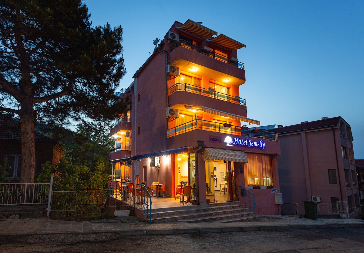 All three suites in hotel "Jemelly" includes large terraces overlooking the sea, refrigerator with mini bar, air conditioning and TV. Each room has a private balcony with mountain view, TV and air conditioning. Nine of the rooms are double rooms with two beds, one with a double bed.