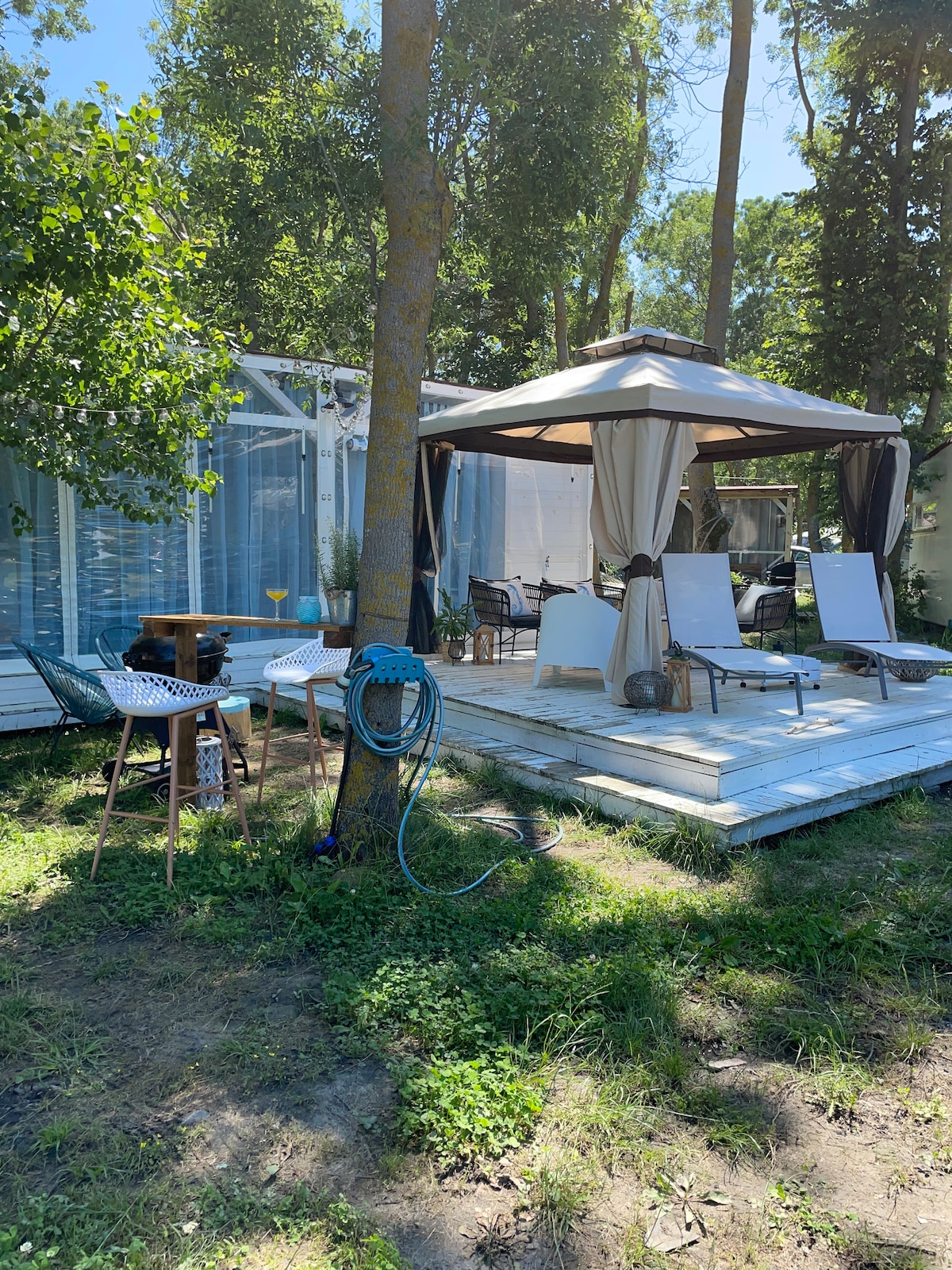 Под прохладната сянка на горските клони на къмпинг "Offshore" Градина се намира нашата каравана. Тя предлага удобството да се потопиш в морето без дори да слагаш джапанки, защото се намира на 100 метра от водата. Ако решиш да се възползваш от айляка, който предлага, през деня можеш да си релаксираш на диванчетата на верандата, да се излежаваш на хамака или дори и да се правиш, че работиш от вкъщи. От 2024 караваната разполага и с изцяло обновена баня с тоалетна. NB! Водата не е годна за пиене