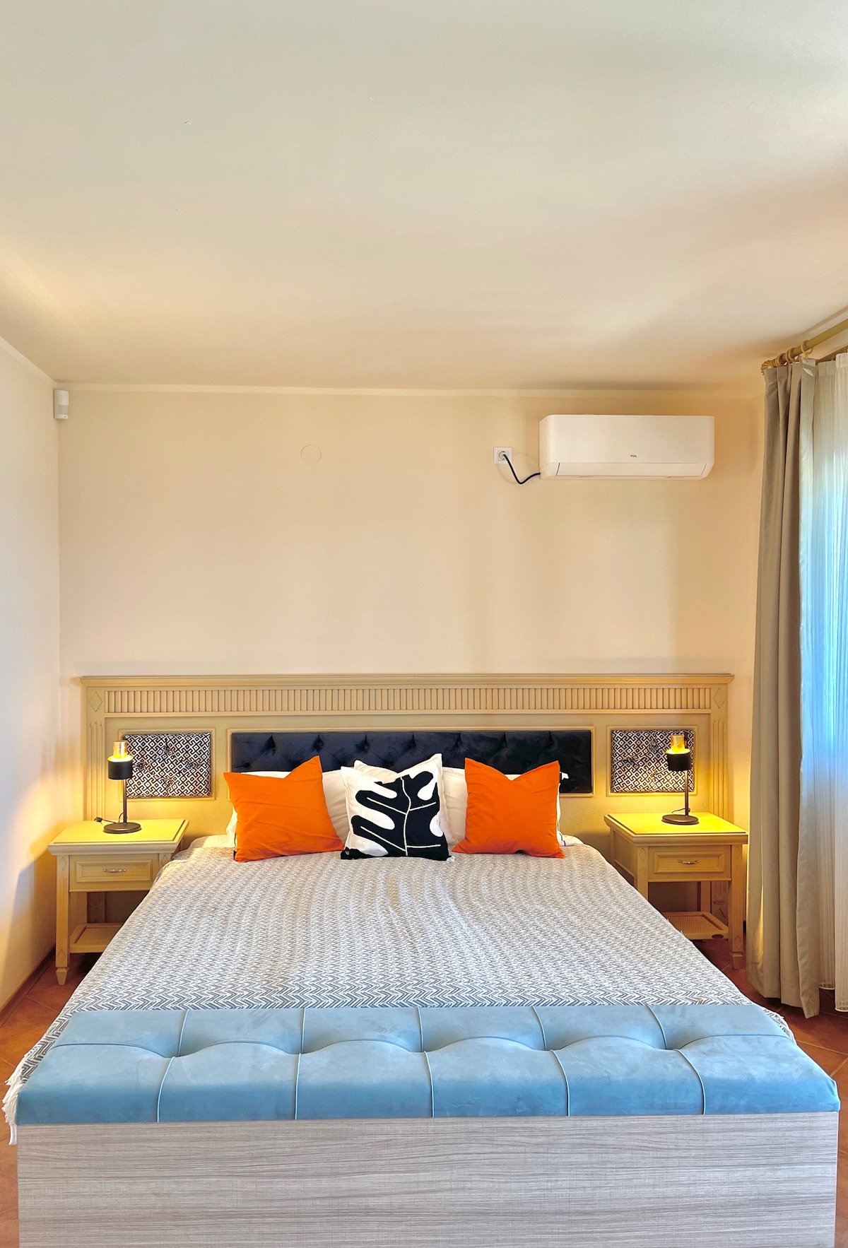 A large apartment fully occupying the 2nd flood of the house, 3 bedrooms, each with a separate balcony, 6 large regular beds(100x200cm). Fully equipped kitchen and another kitchenette in one of the bedrooms, two separate bathrooms (one big and one small), cable TV, air conditioning in every room, free WiFi.