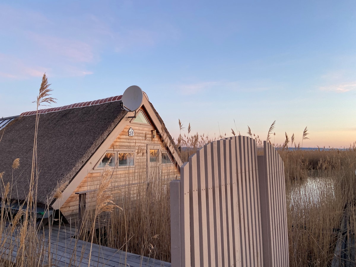 Willkommen in unserer Schilfhütte, direkt am Neusiedlersee. Das Schilfchalet befindet sich mitten im Schilfgürtel über dem Wasser. Über einen Lärchenholzpfad gelangen Sie zu dem voll ausgestatteten Chalet das auf einer großen Lärchenholzplattform über dem Wasser im Schilfgürtel am Neusiedlersee errichtet ist. Auf der Vorderseite können Sie direkt in den Naturpool steigen (0,5m) und mit dem kleinen Ruderboot über den Kanal auf den See hinaus fahren.