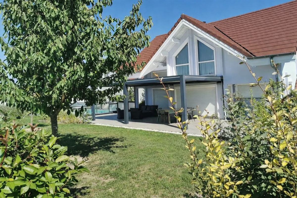 Rien que pour vous Chalet de 75 m2 au bord de la rivière dans un environnement calme entre Annecy et Genève et proche des lieux touristiques Vous profiterez en extérieur de 2 terrasses dont une abritée dans un parc de 5000 m2 un réel cocon de tranquillité au cœur de la nature pour un retour aux sources et une déconnexion le temps d'un séjour. Nos amis les animaux ne sont pas acceptés du fait de la proximité d'un haras et du passage des chevaux sur le chemin.