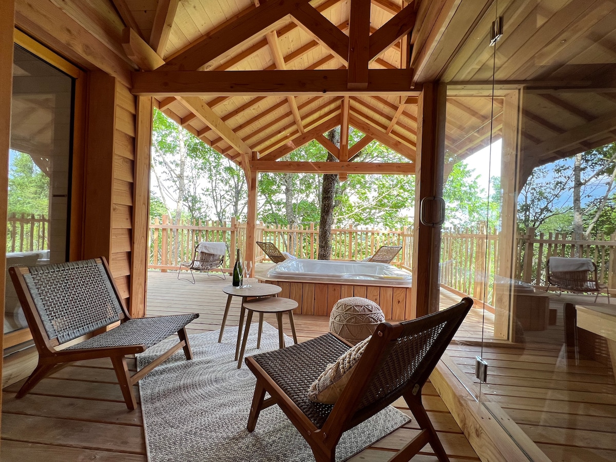 Venez passer un séjour atypique perchés à 5m de haut dans les cimes de chênes centenaires. En couple ou en famille, profitez d’une expérience insolite dans un cadre naturel. La Cabane de la Mûre d’une surface de 35 m2 environ peut accueillir jusqu’à quatre personnes. Elle dispose d’une chambre, d’une salle de bain, d’un grand séjour (canapé lit en 140), cuisine entièrement équipé et climatisé. Une large terrasse extérieure accueillant un spa privatif chauffé toute l’année.
