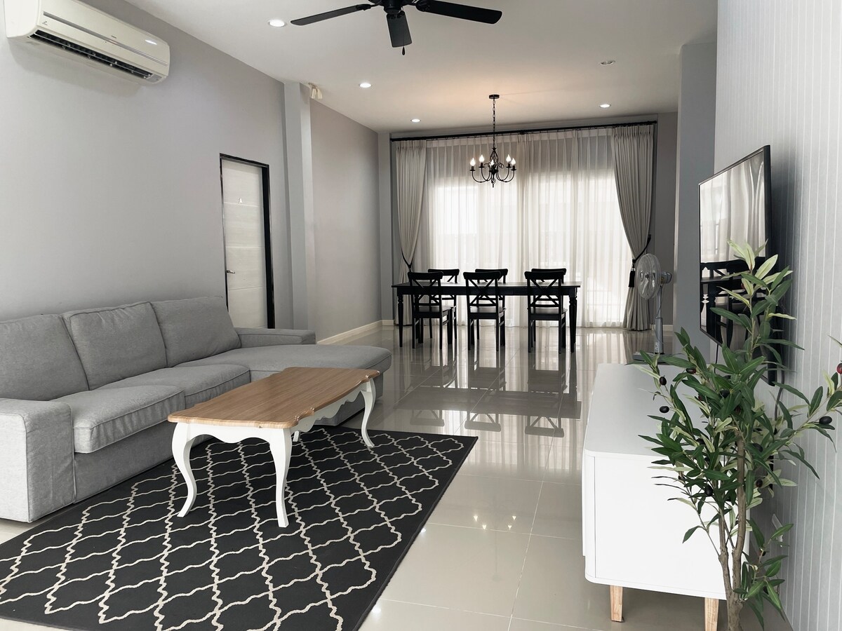 A 2-story house in Buriram city With complete amenities There are kitchen utensils. There is a fitness center and swimming pool at the common area. There is a 24-hour security guard and close to important places such as Robinson University, Chang Stadium.