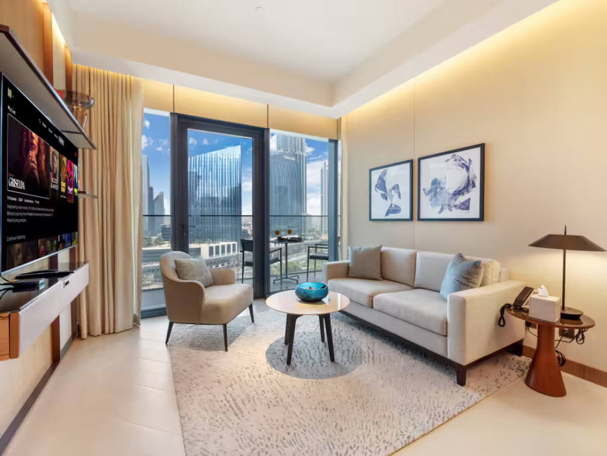 Stay in the heart of Downtown Dubai with direct Burj Khalifa views and indoor access to Dubai Mall. This modern apartment offers a prime central location with shopping, dining, and major attractions just steps away. Guests enjoy access to a swimming pool and fully equipped gym, both overlooking the Burj Khalifa. Wake up to the city skyline and enjoy a comfortable, well-located base in one of Dubai’s most iconic districts.