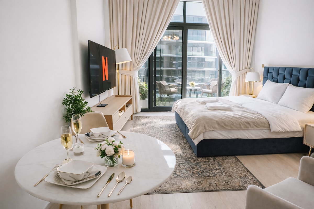 This elegant studio, located in a newly built tower in the heart of the city, offers new and modern furnishings for a comfortable stay. Enjoy the skyline views from the large windows and prepare your favorite meals in the fully equipped kitchen. Security is guaranteed 24/7, allowing you to relax without worries. Just steps away from attractions, restaurants and shopping malls, this studio is the perfect base from which to explore Dubai. Book Now