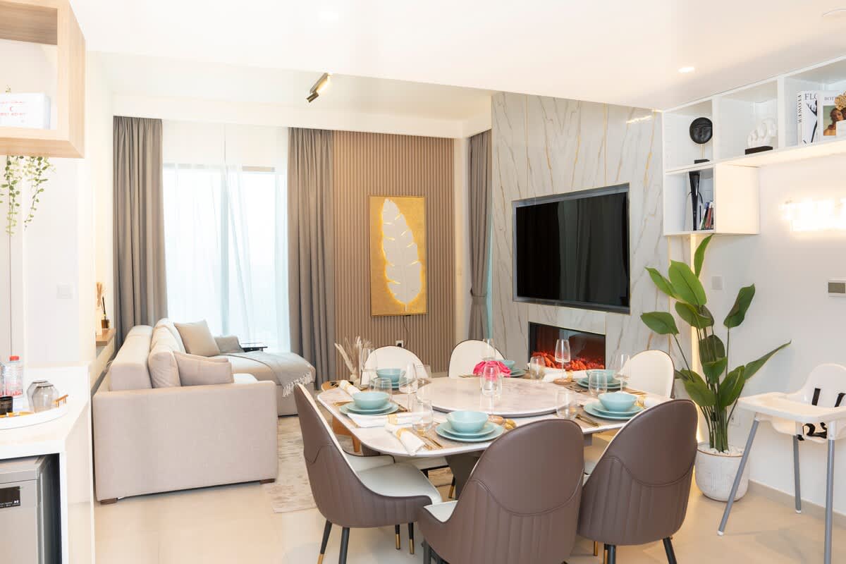 Luxury living in Port de La Mer! Enjoy a King-size Four Seasons bed with premium mattress & linens, sofa bed for 2, safe vapor fireplace, Dyson hairdryer, De’Longhi coffee machine & yoga mat. The dining table doubles as a workspace. Pool, parking & private beach access included. Steps from the sea, cafés nearby, 15 min to Dubai Mall & 20 min to the airport – perfect for guests seeking something special!