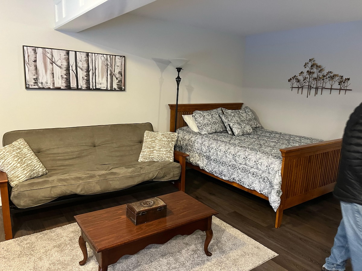 Our condo sports everything you will need for your stay. We have one bedroom with a queen bed, and two twin pull out couch beds in the living area. Full kitchen, laundry, dining area, porch with dining table and chairs, and an electric BBQ grill. Condo has direct Kingdom trail access on site, bike storage is ok inside or on porch. There is some summer siding work going on, the crew is very good but be aware work commencing. Enjoy your stay!!