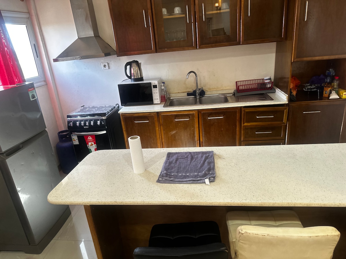Notre 3 chambres salon situé à la cité Azimo Vous avez droit à une dame de ménage. un vigile pour votre confort et votre sécurité. De plus, vous pouvez profiter de la terrasse et de la machine de sport. De l'espace BBQ pour des moments de détente en famille ou entre amis. Notre jacuzzi (type spa ) est également à votre disposition pour des moments de relaxation. Polytank en cas de coupure d’eau disponible. Garage pouvant prendre deux véhicules. Wifi disponible, une personne Ps4 disponible