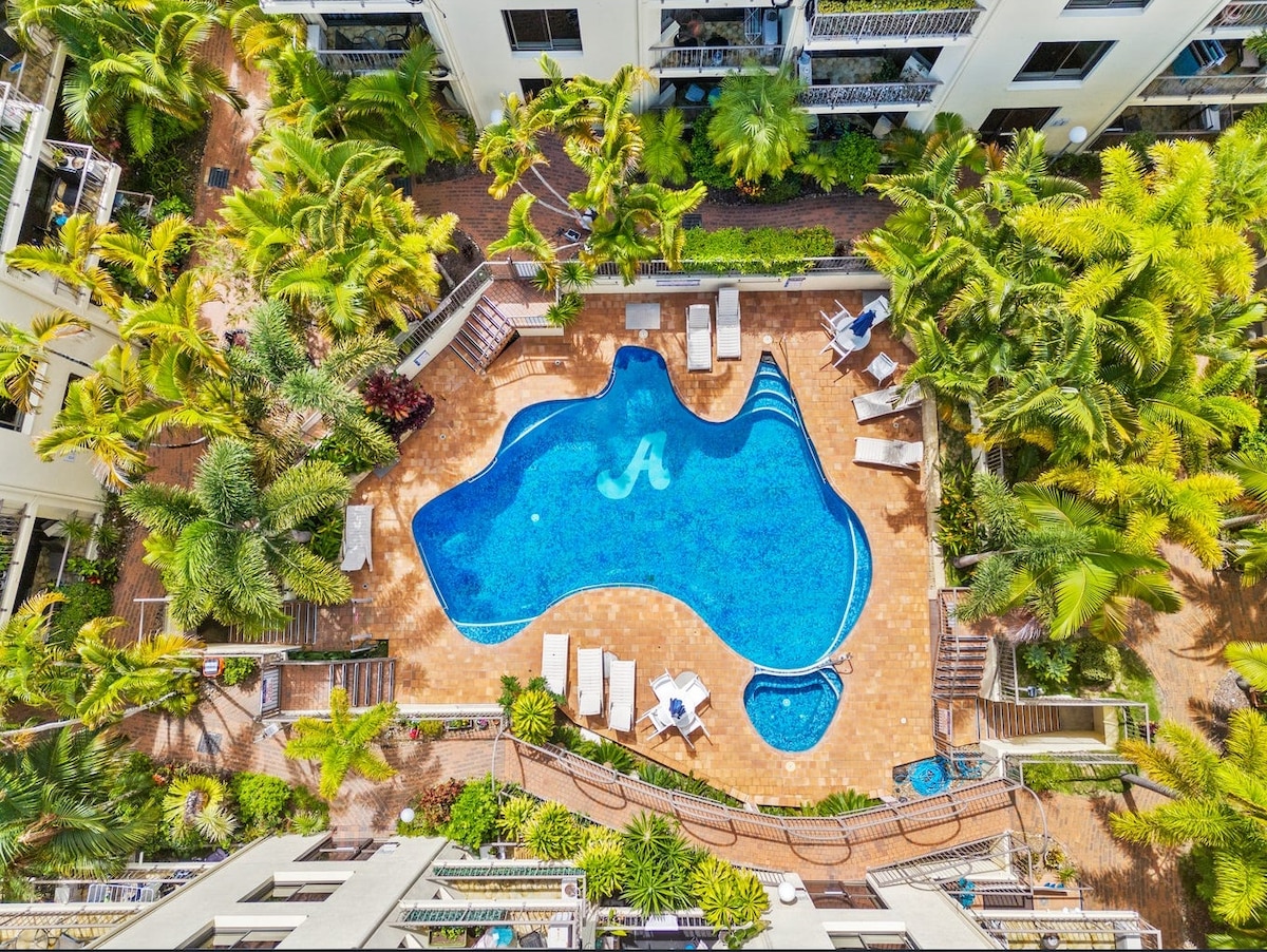 ***Discounts, LAST MINUTE, WEEKLY 10%, MONTHLY 25% disc.***Enjoy a fully renovated air/cond + ceiling fans, 1 bed/1 bath, full kitchen unit in a quiet complex. 2 people max. Pool/BBQ area. Luxury pillow top queen bed, rain shower head. Unlimited NBN internet, chromecast, 48" UHD TV & soundbar. 300m walk to Burleigh Beach, 800m walk to James St shops, food, cafes. Bath towels and bed linen supplied, laundry/shower products, oil, tea & coffee etc in pantry. No Smoking in unit or balcony.