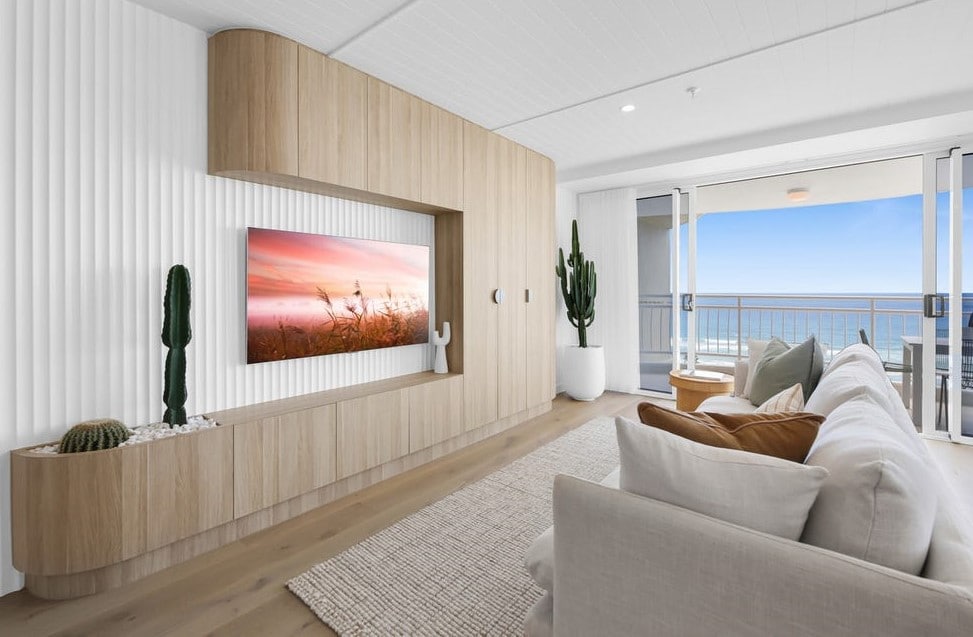 About: It’s time to ignite your senses, recoup and relax in luxury at one of Burleigh’s most premium addresses. Meticulously renovated with Palm Springs inspiration, this exquisite two-bedroom,two-bathroom beachfront apartment provides uninterrupted panoramic views of Burleigh Headland and is the getaway that just keeps on giving. With no expense spared, the sundrenched interiors burst with quality coastal luxe finishes and furnishings and architectural design that captures the essence of beauty