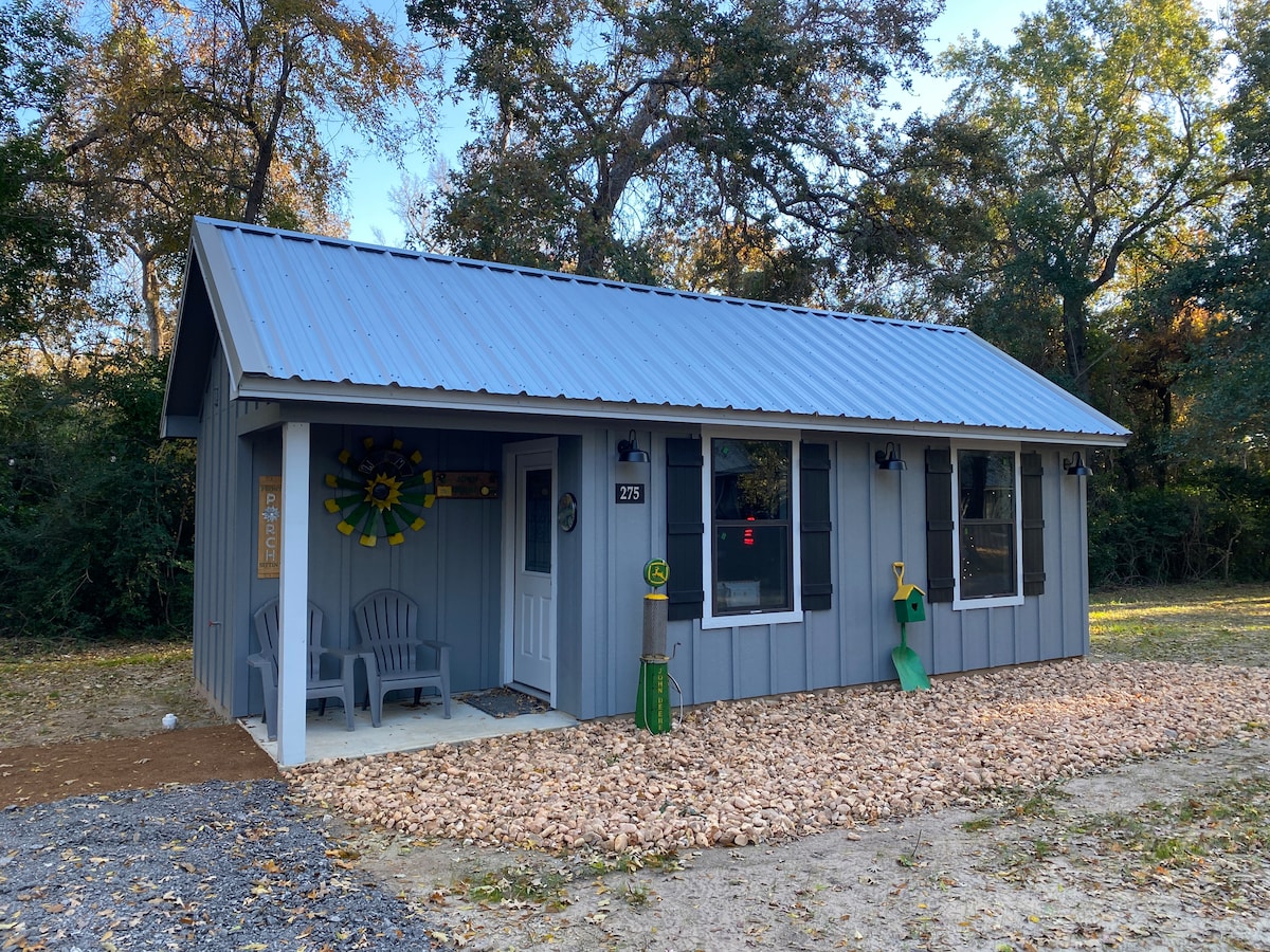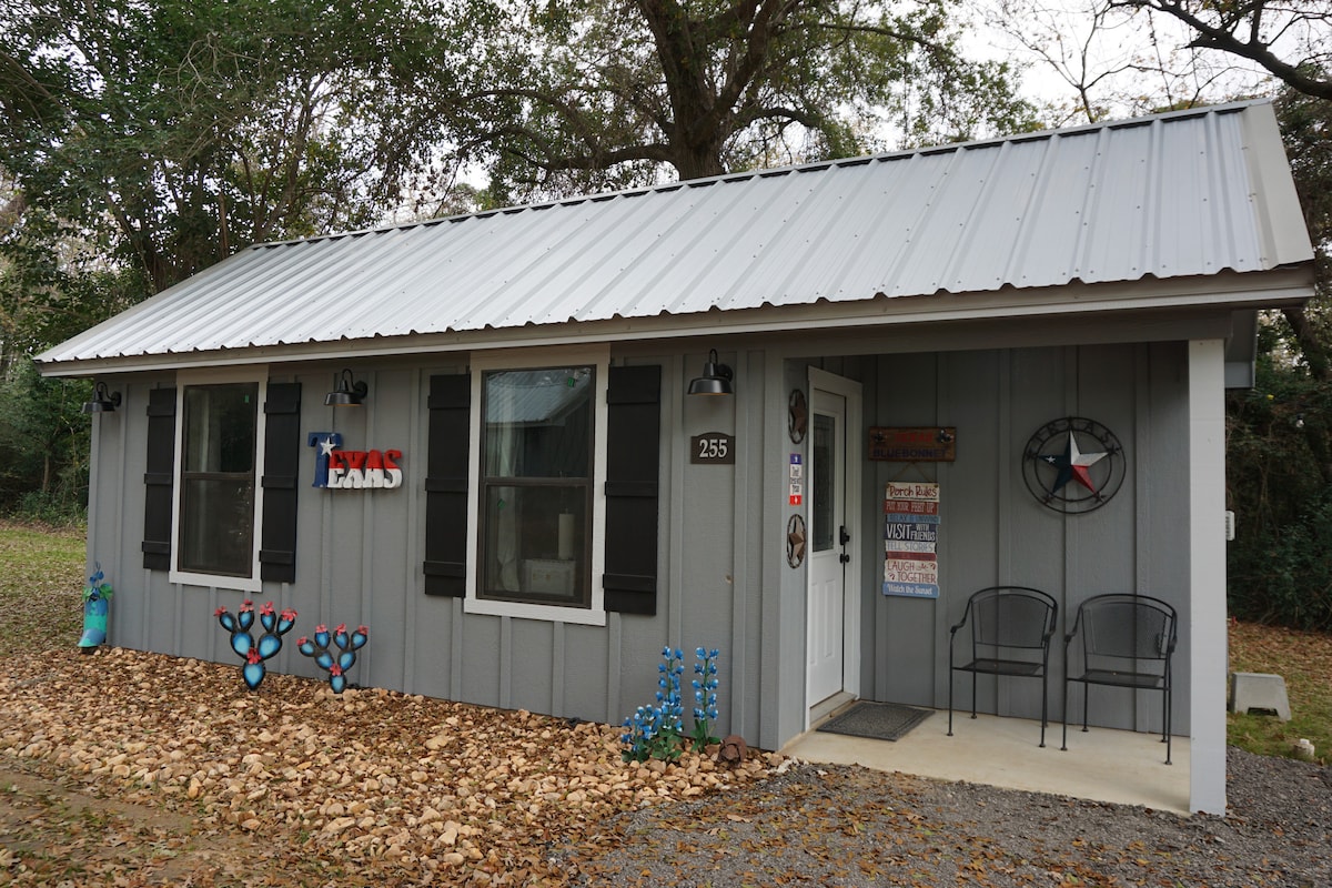 This Tiny House of John Deere shares a shady hideaway with 5 other Tiny Houses. The perfect cozy spot for mid-week guests visiting for business or pleasure, weekend guests, and walking distance for Wedding Guests of Circle C Barn Venue. We are Dog Friendly. Our Per Dog fee is $50 per stay. Longhorns are in a fenced in area for guests to enjoy and view at a distance - stay back 10' from the fence.