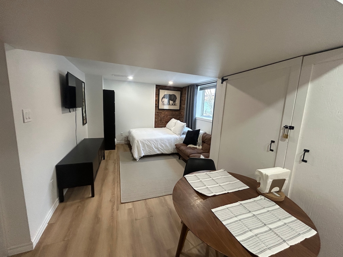 WELCOME TO Modern Luxury ~ studio apt. in Bloor West Village ~ 5 min. walk to subway - minutes to Gardiner Expressway & QEW ~ park FREE on driveway ~ private entry ~ private patio ~ 10 ft. ceiling ~ KING BED ~ separate glassed-in shower ~ kitchenette ~ toaster, drip coffee maker, microwave, tea kettle, dishes ~ mini fridge ~ 55” TV ~WI-Fi ~HEATED floor ~ walk to restaurants, sportbars , shops ~ minutes to Old Mill Inn and Humber River