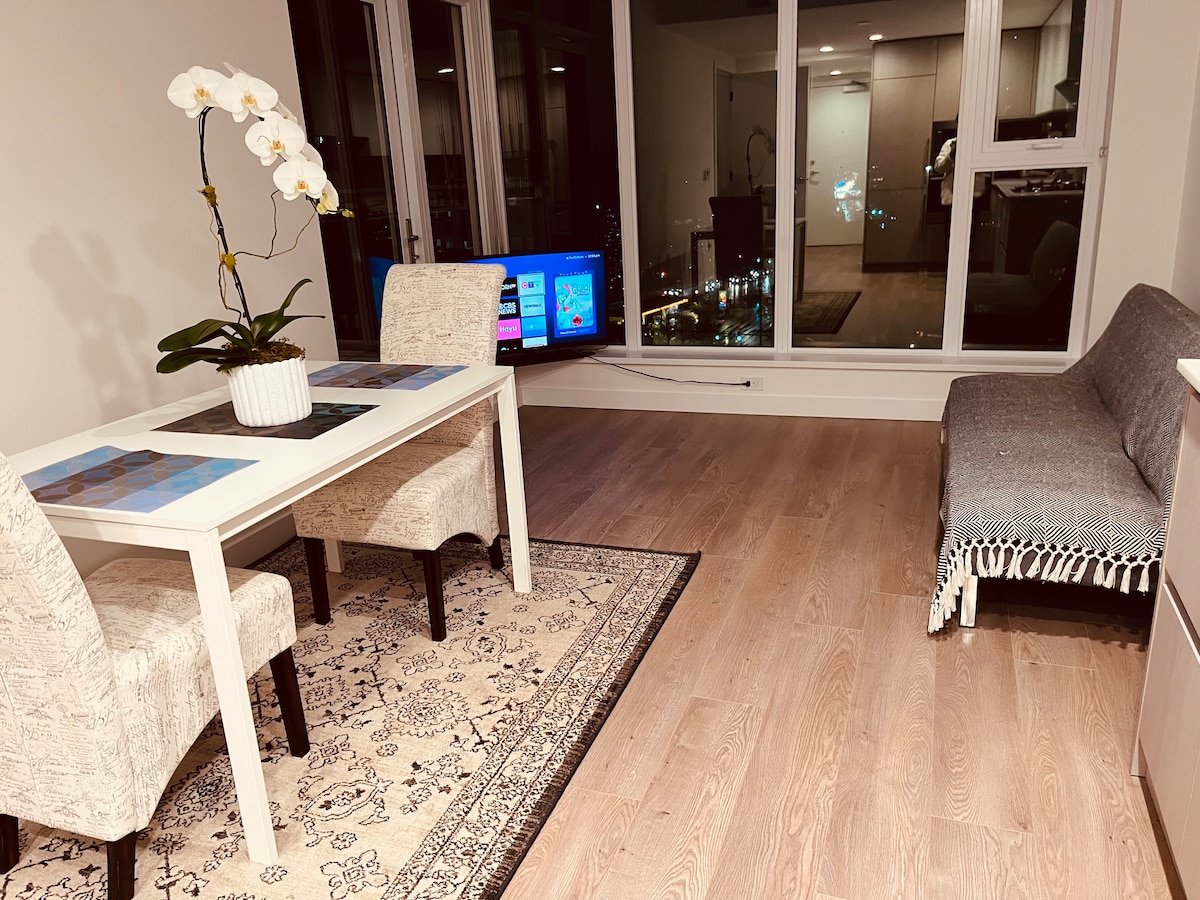 Brand new one bedroom entire unit at Metrotown area . 500M from skytrain station. 700M from Crystal mall , Metrotown mall . Enjoy the amazing mountain and city views from Balcony and Rooms . Queen size bedroom, one full bathroom and one signed garage parked , in suite laundry . provide cookware hair dryer , coffee toaster towels ….. free access gym, sauna, music room , meeting room. Step by Crystal mall , Metrotown mall . 8 mins walk to skytrain station.
