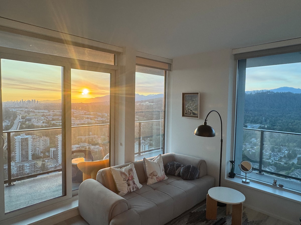 New & modern 1 bed and 1 bath apartment with a dedicated room for the office. - Central A/C & heating - Smart TV with Netflix - Highspeed optic fibre internet - Floor to ceiling windows - Coffee machine - Body wash & shampoo/conditioner - Full kitchen In-building access to the gym, swimming pool, hot tub, sauna, pool table, table tennis, and 33rd floor lounge. - 7 mins walk to skytrain station - 7 mins walk to shopping mall - 5-10 mins drive to the golf course, SFU, parks, and Lougheed HWY