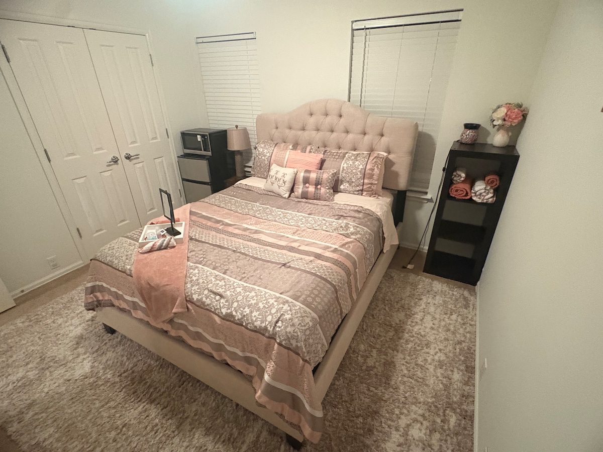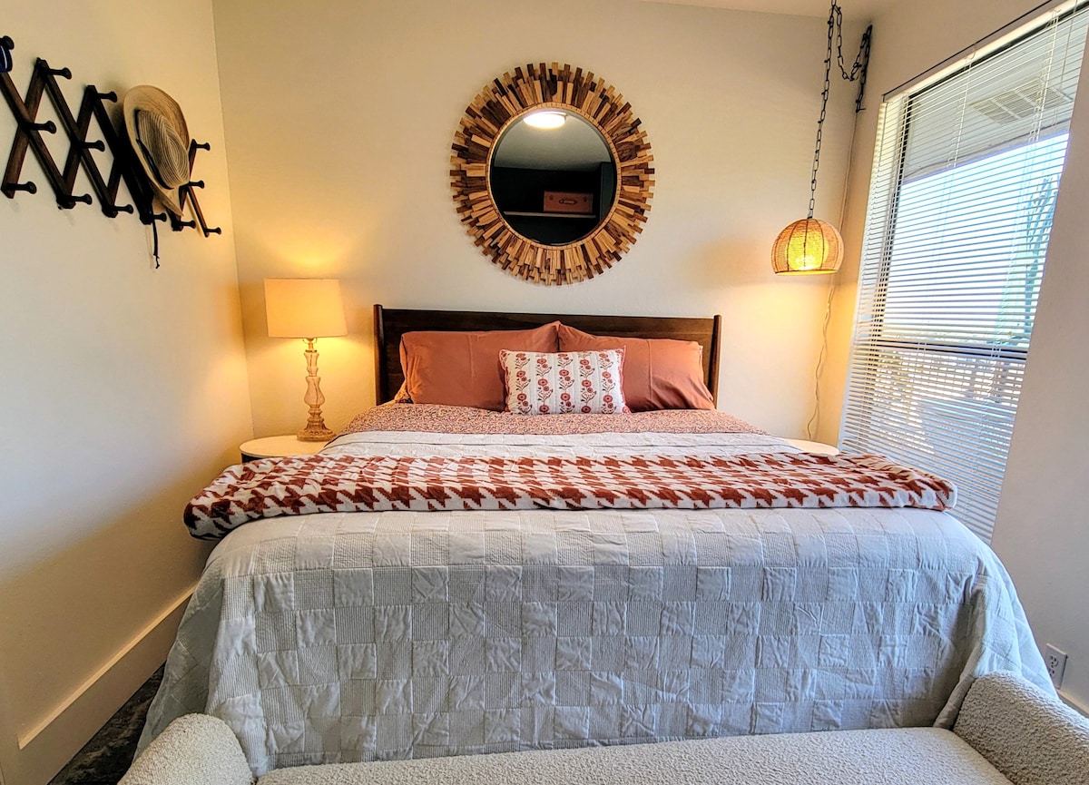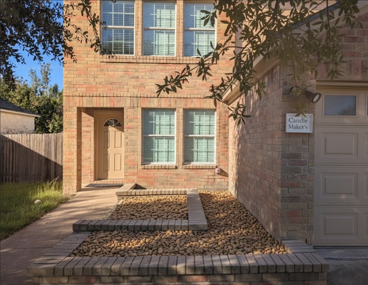 👑KING Master Suite! Candle Maker's Cove is a 3-bed, 2.5-bath whole home. Rare oversized Master (14x18ft): KING Bed, black-out curtains, and deep garden tub 🛁. Unique luxury! Amenities: Dedicated desk 💻 w/ blazing Gigabit AT&T REAL FIBER INTERNET 🚀 & Commercial HEPA Air Filtration 💨. **ASK ABOUT GROCERY PRE-STOCKING SERVICE!** Full kitchen & fenced yard 🐕 (pets welcome!). Central TX base.