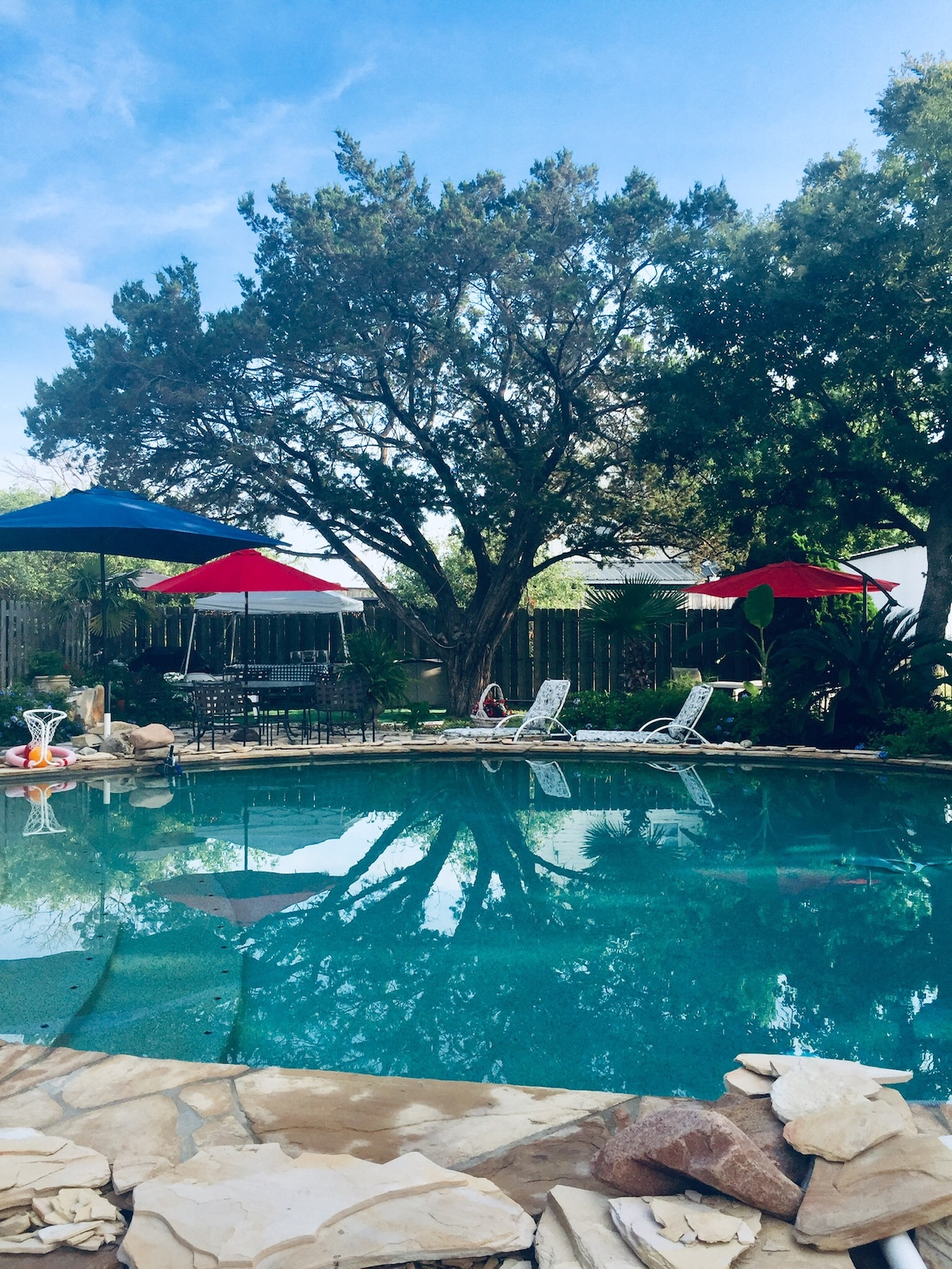 You can NOT believe this is an RV. It is very spacious and super beautiful!!! Walk out of the door to the water and fish and swim and cook on the grill. We have many cottages and RVs spaced all around the property. We have a boat ramp for putting your boat in the water. This property was once owned by Willie Nelson. It was called Camp Pedernales. Come enjoy ****Due to the current drought the water levels are down. The boat dock and boat launch is currently out of the water.