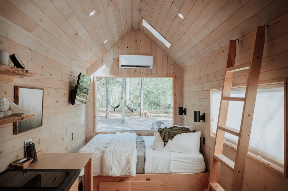 Retreat to our private, modern tiny home in the forest. Take in ten secluded acres of woods complete with an electric barrel sauna, outdoor rainfall shower, luxury king sized bed with stunning views outside, a spacious patio with outdoor dining, fire-pit and more! Just over an hour north of the Twin Cities, enjoy modern conveniences like WIFI, smart TV, mini kitchen, full bathroom, and a loft. Located only 1/4 mile from the St. Croix River. ***Now booking 9 months in advance.