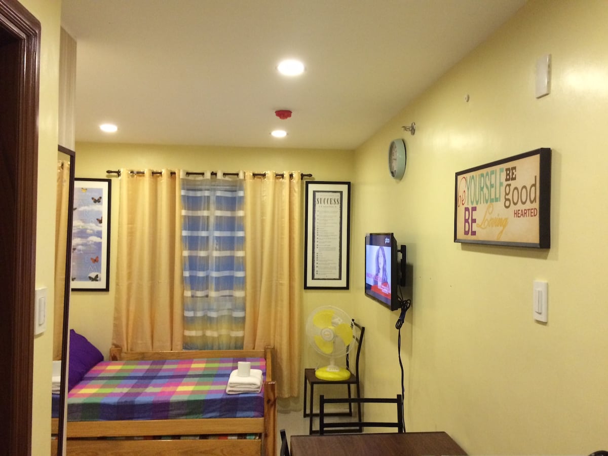 Styled & Managed by JQ PROPERTIES Cozy, private, and fully-furnished studio unit with fast wifi (10mbps). Comfy queen bed with Netflix on TV. Have extra guests stay with you with the comfy extra double mattress on the floor. This unit is located in a prime and vibrant area with lobby access to a mall with Savemore supermarket on lower ground. Across University of Baguio (UB), around the corner from restaurants and shops on session road, and walking distance from Burnham Park and SM.