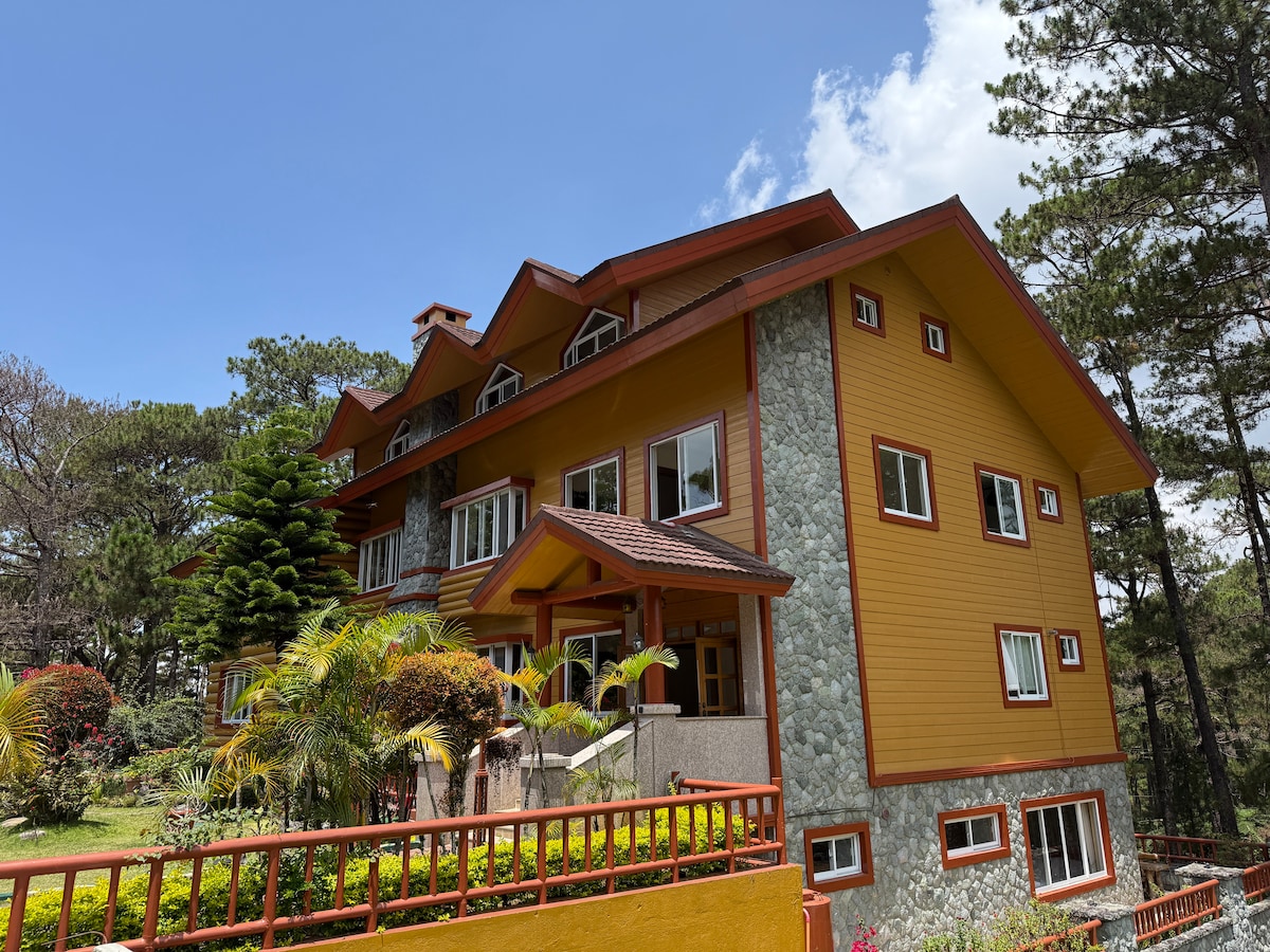 Enjoy mountain views and crisp fresh air in this cozy, stylish and charming home 10 minutes from restaurants and attractions such as Camp John Hay, Mines View Park, The Mansion House and others. Perfect for families and groups of friends, this pet-friendly and wheelchair-accessible home offers an indoor fireplace, 2 outdoor fire pits, 4 bedrooms with bathrooms, a full kitchen, alfresco dining, front and back yards; cableTV, karaoke machine, & fast internet for those who wish to work from home.