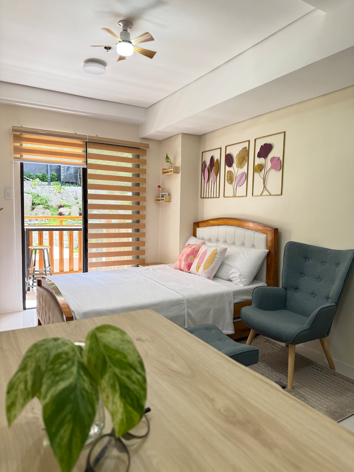 Serene retreat for those looking for a peaceful escape from the city, yet still within easy reach of popular tourist attractions. Our minimalist-style space is designed for freedom and relaxation, allowing you to unwind in comfort. With natural light and fresh ventilation flowing through every corner, you’ll enjoy a refreshing morning breeze, warmth of the sun, & the cool misty afternoons—Baguio it is! Balcony offers a view of the mini waterfall and the tranquil garden of Balai de Selendra.